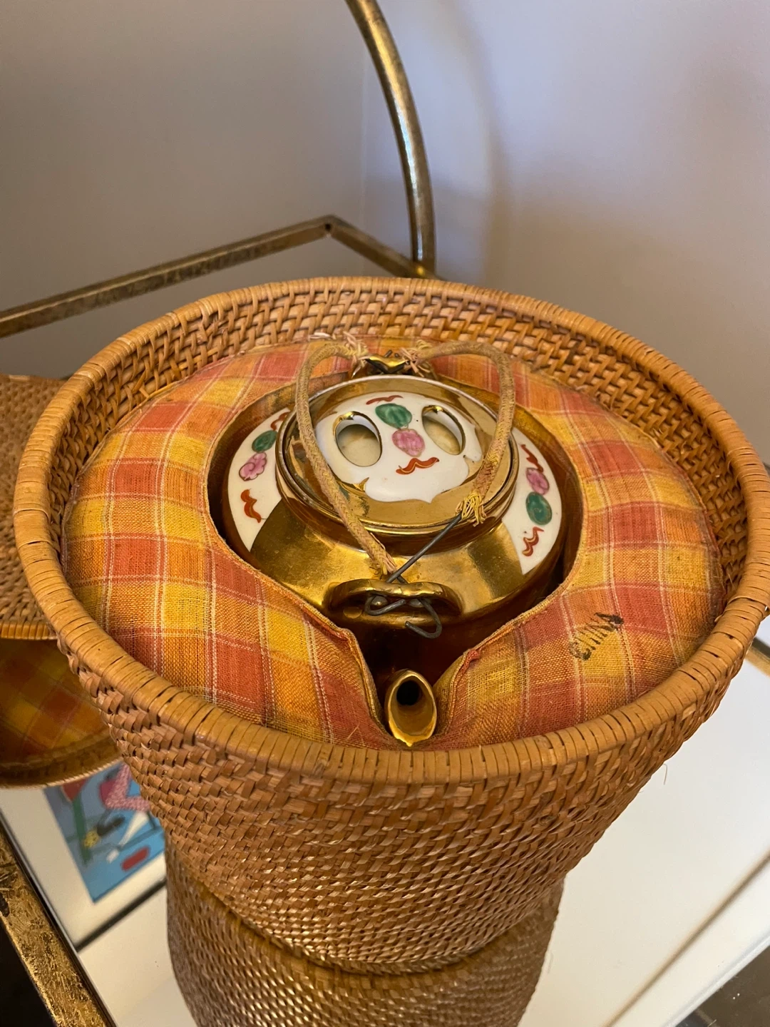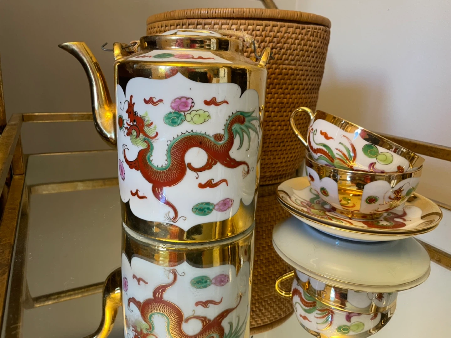 Beautiful vintage Chinese tea set featuring a stunning dragon and phoenix design with gold accents. Includes a teapot, cups, and saucers. Perfect for adding a touch of elegance to your tea time! . Located In Osborne Village with easy access to driveway for pickup . Selling a vintage 1940’s Chinese Tea Pot in the cozy basket and including 2 cups and saucers to match. This tea pot was gifted to my family in the 1940’s by the gentleman who owned the restaurant next door. It is in very good vintage condition. The fabric in the handles has frayed and there are 2 small flaws on the basket lid. The actual tea pot has no chips or cracks . The interior is very good considering it was used for many decades. The cups are perfect. The basket measures about 8” tall and the lid is about 9” wide. The pot is large, would hold at least 8 cups . It is waiting to go to a good home . . Accepting etransfer for guaranteed hold and FCFS for cash transactions . You are welcome to view before purchase in my spacious comfortable well lit lobby. By appointment . Please see my other listing as I am downsizing . I also have a lovely hand painted chocolate pot set as well.