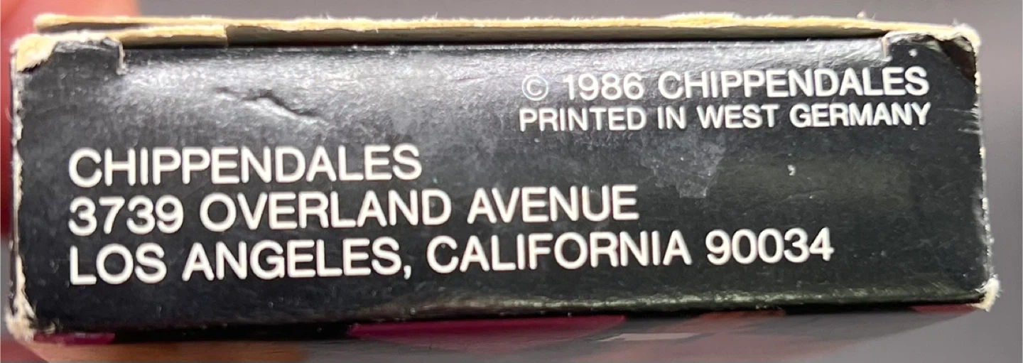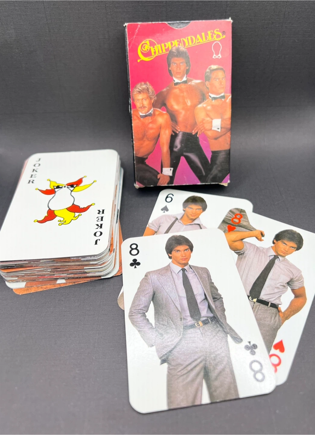 Selling a vintage deck of Chippendales playing cards. The cards feature images from the iconic male revue. The box is included and shows some wear consistent with age. A fun collectible item!