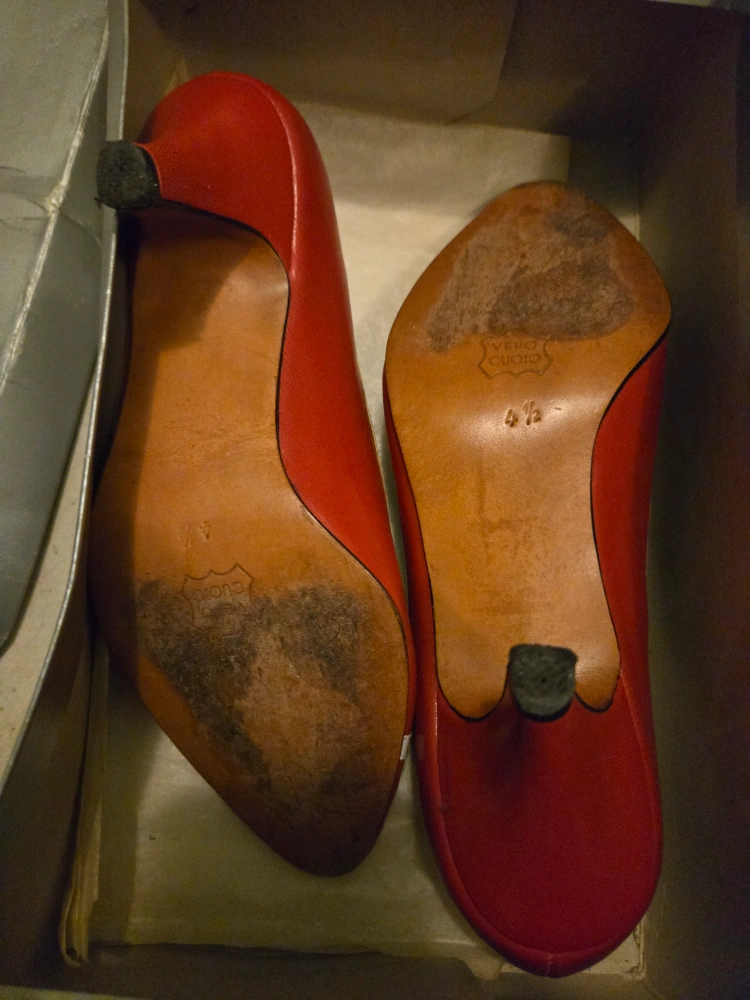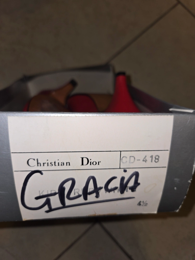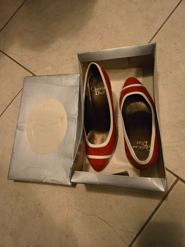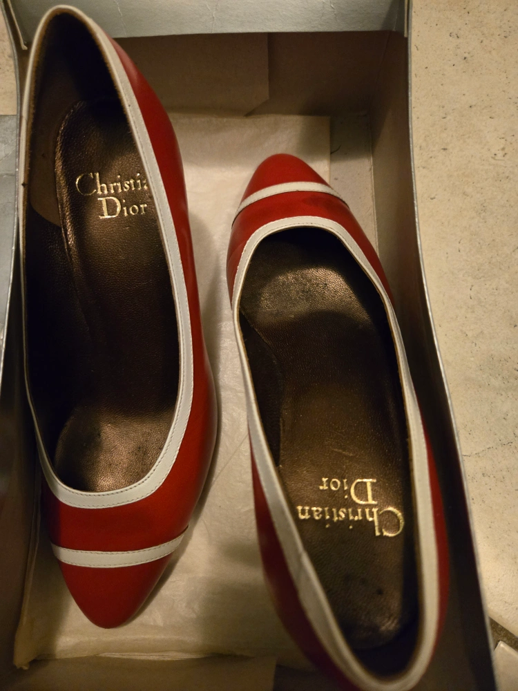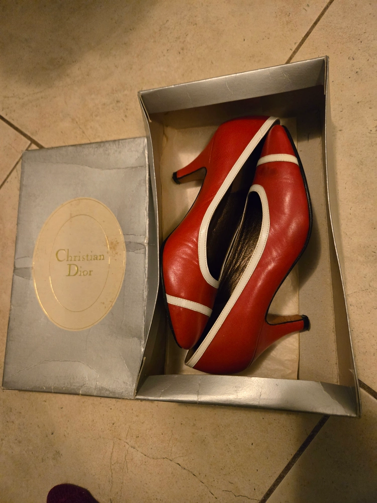 Vintage Christian Dior red leather heels with white accents. Size 4 1/2 - a small-footed size 5 could possibly make them work, but don't recommend for a size 5.5-6 (as I am). Real leather soles show slight wear. Open to trade/$ offers.