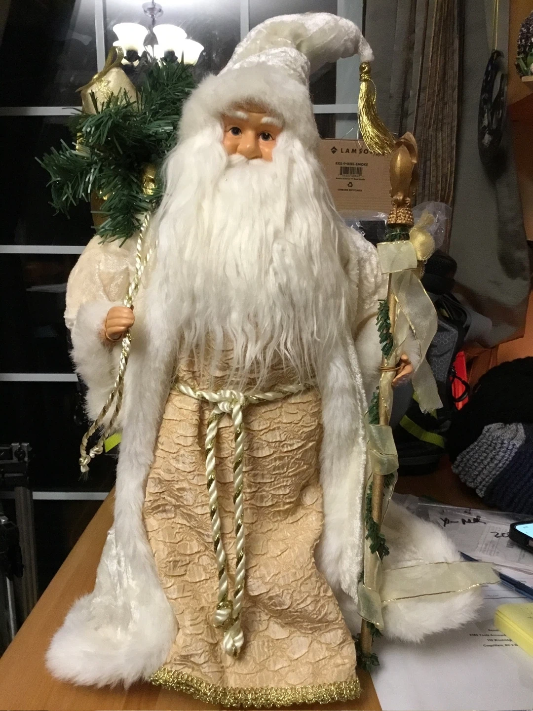Selling a vintage Santa Claus figurine. It has a beautiful white and gold colour scheme. Perfect for adding a touch of holiday cheer to your home!