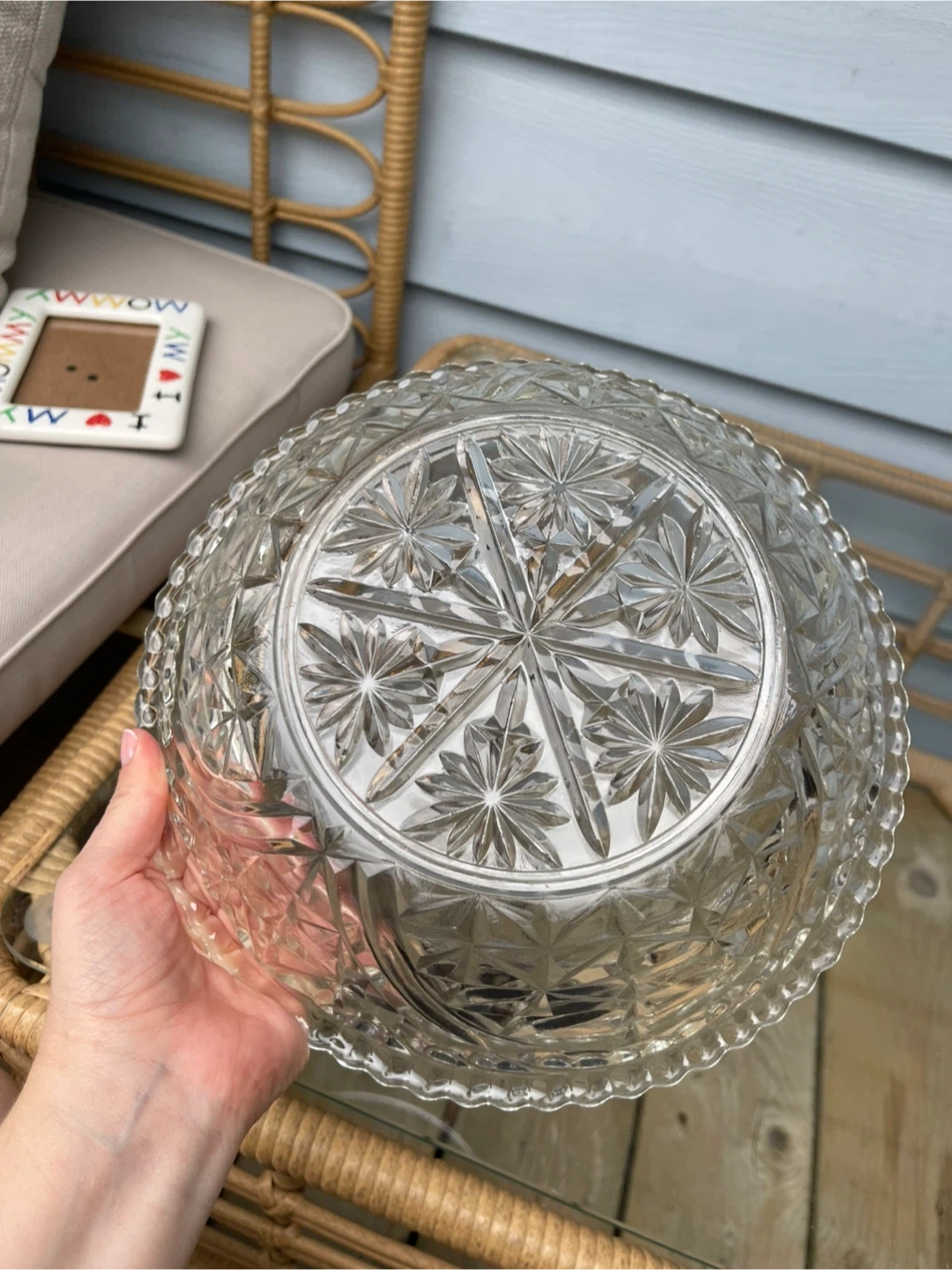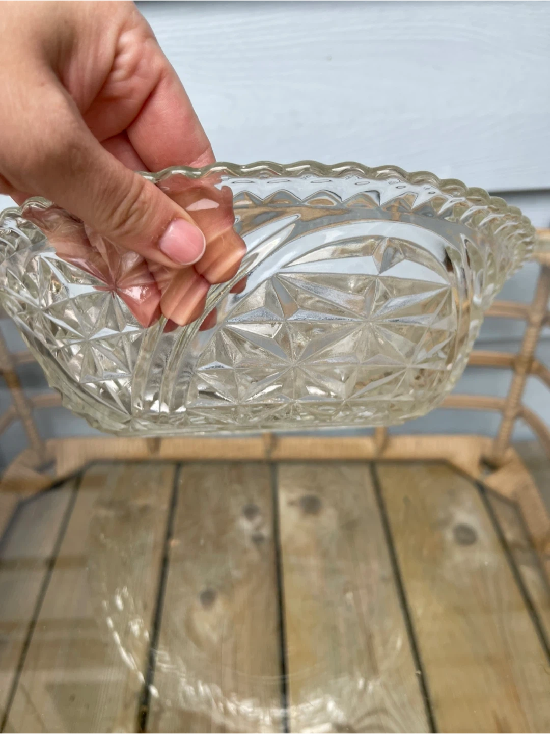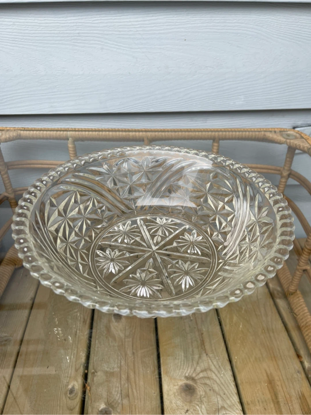 Selling a beautiful vintage clear glass bowl. It has a lovely starburst pattern on the bottom and a delicate scalloped edge. Perfect for serving or displaying your favourite items!