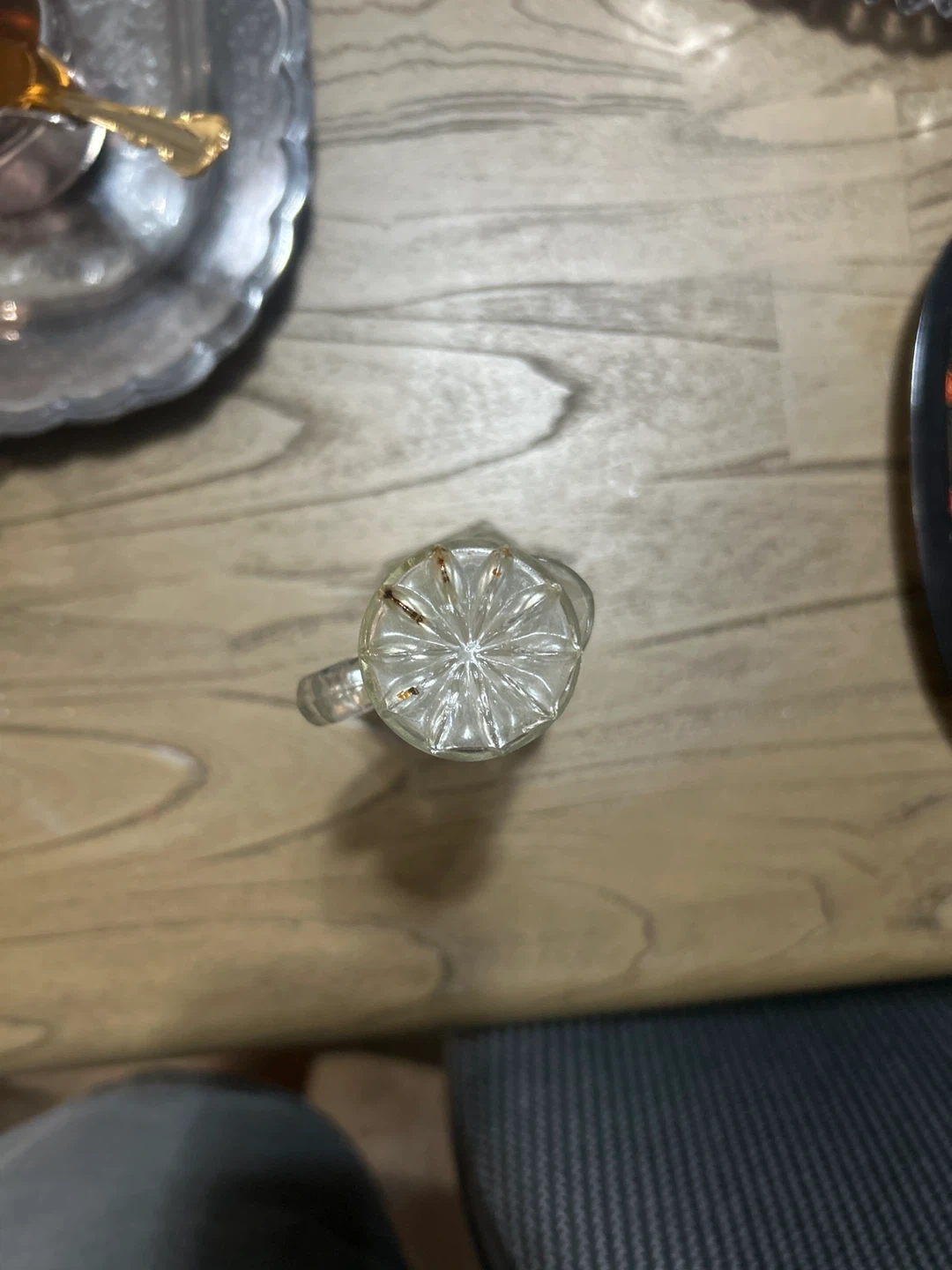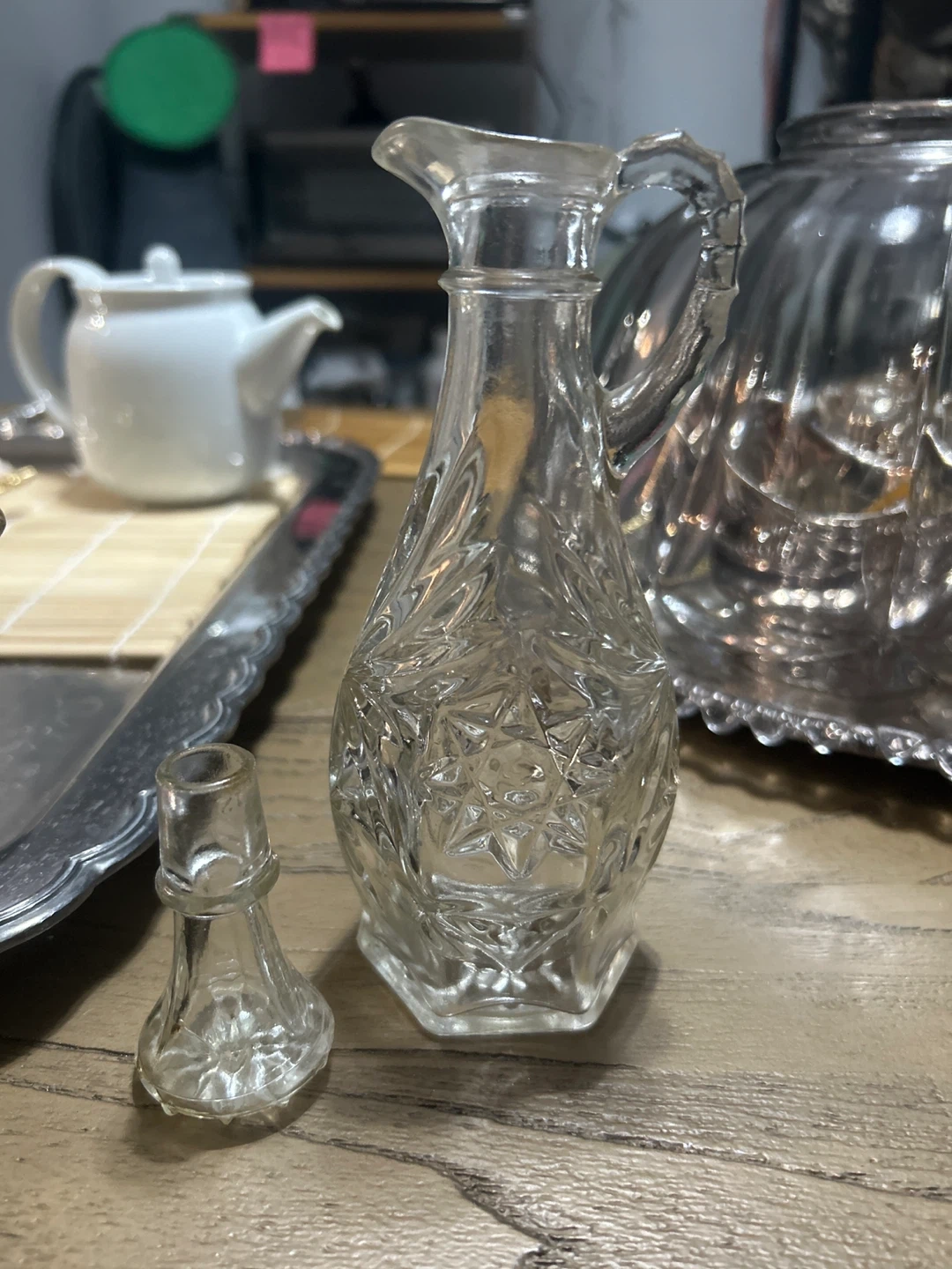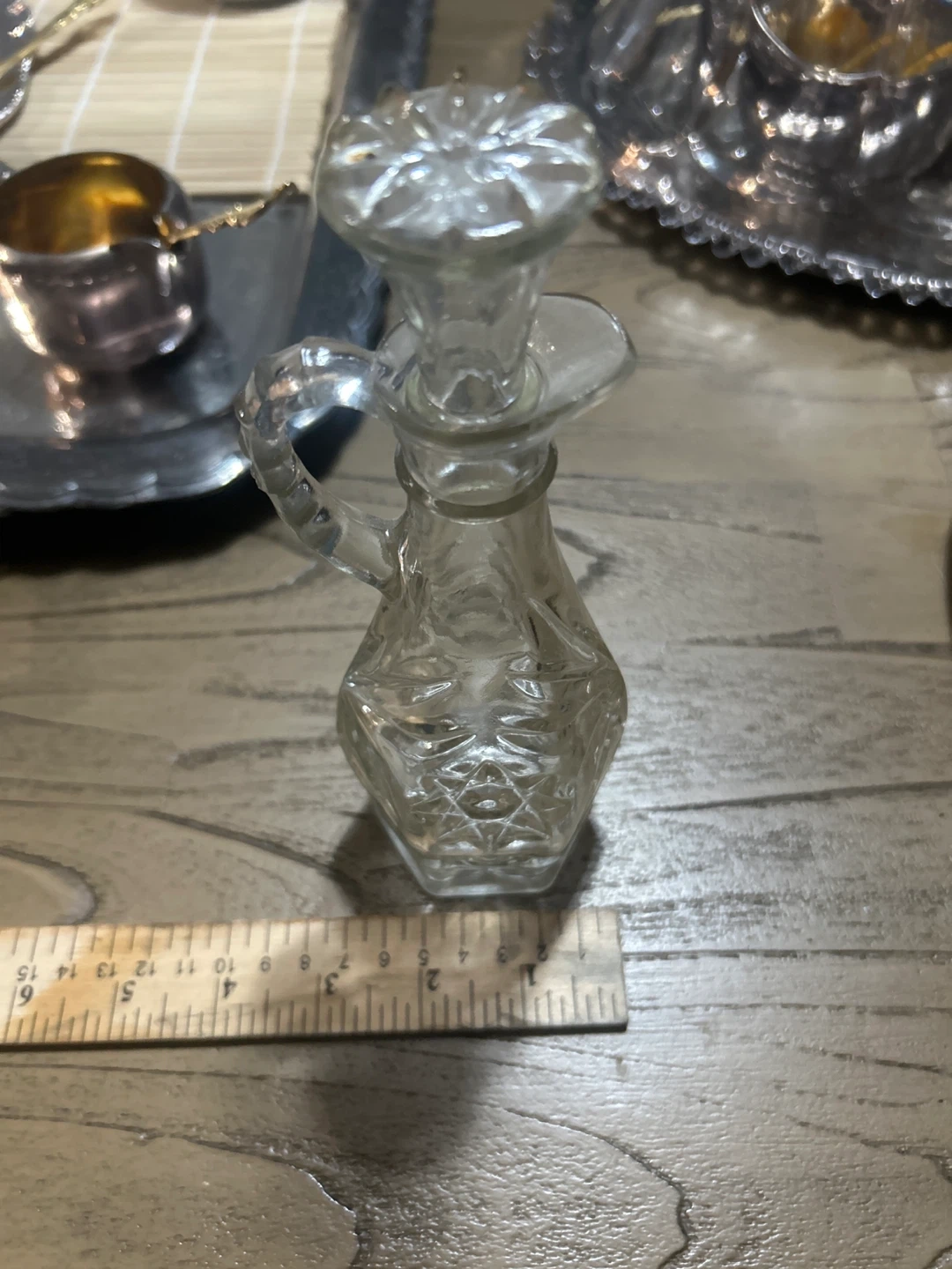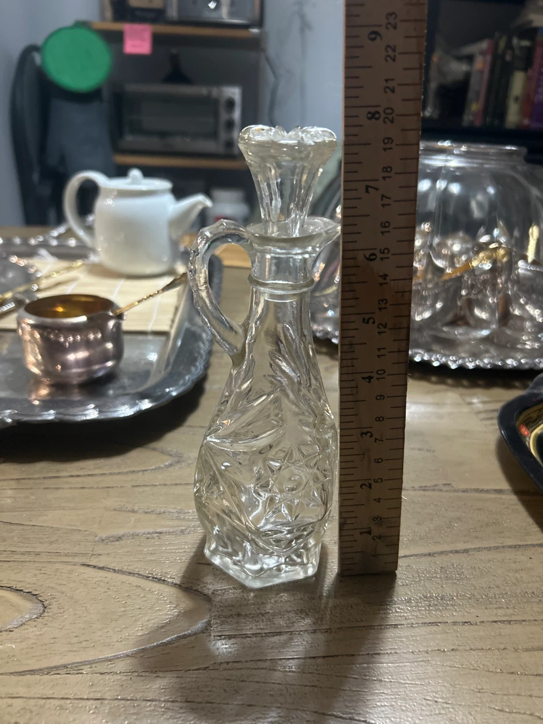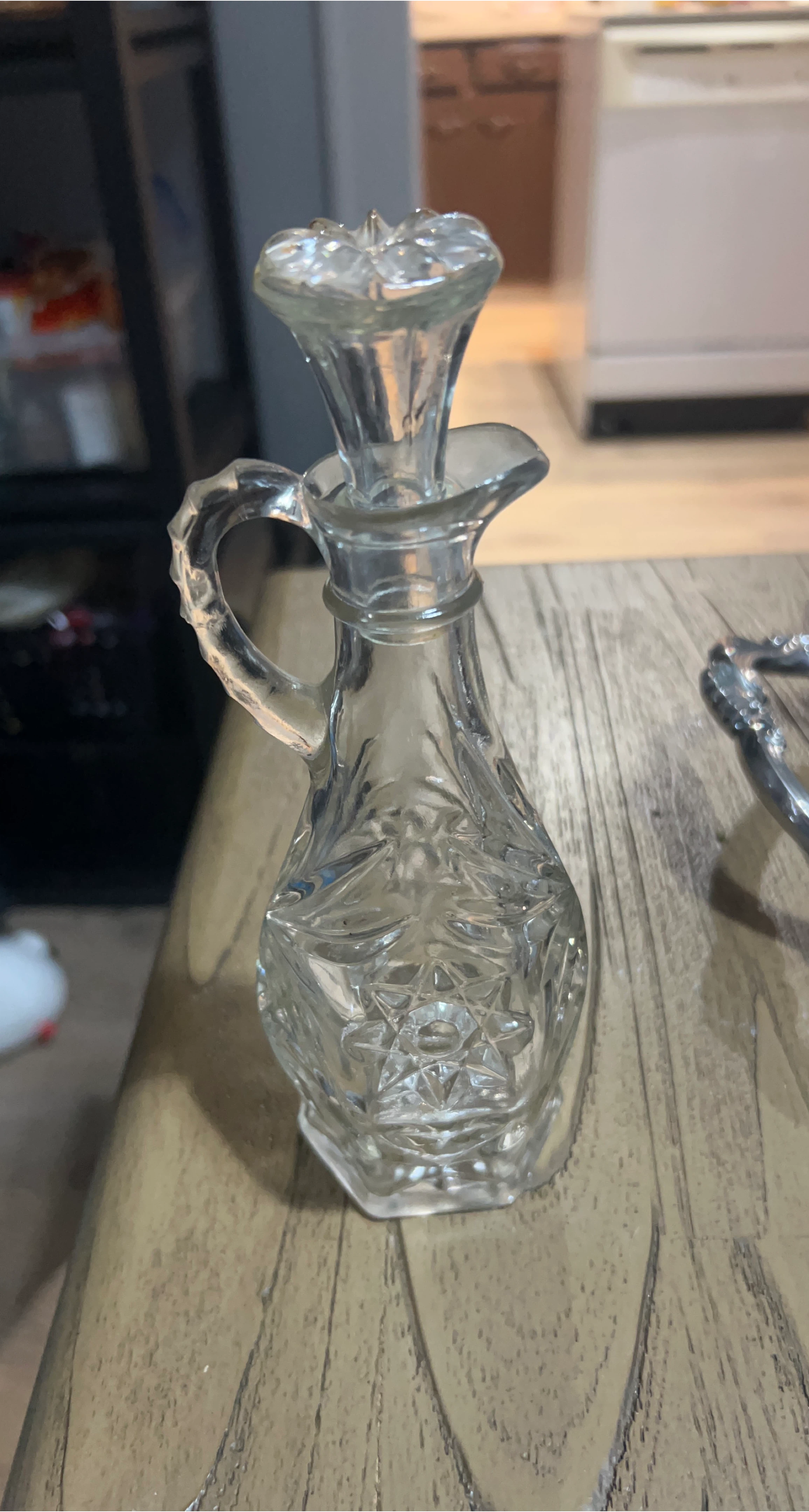 Selling a lovely vintage clear glass cruet, perfect for oil or vinegar. It has a beautiful starburst pattern and a delicate handle. It measures about 6 inches tall.