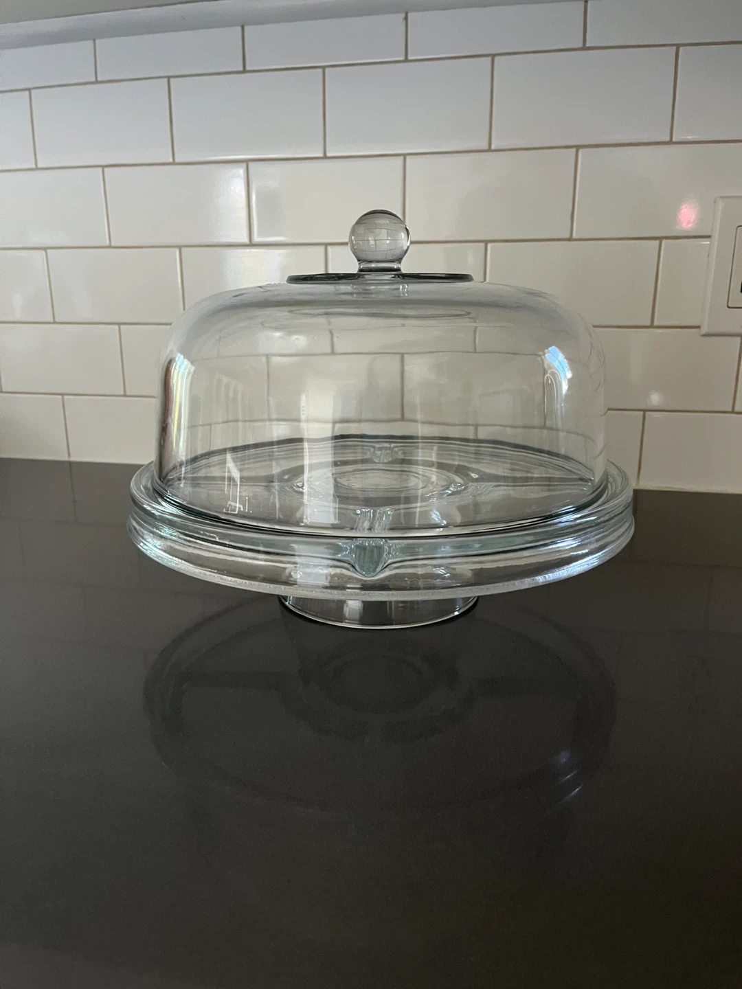 Pick up in Utopia. 11” in diameter, lovely glass cake dome with a matching serving platter. Perfect for displaying cakes, cupcakes, or other treats! The platter can also be used for vegetables or fruit tray with dip. It's in great condition and ready to find a new home in your kitchen