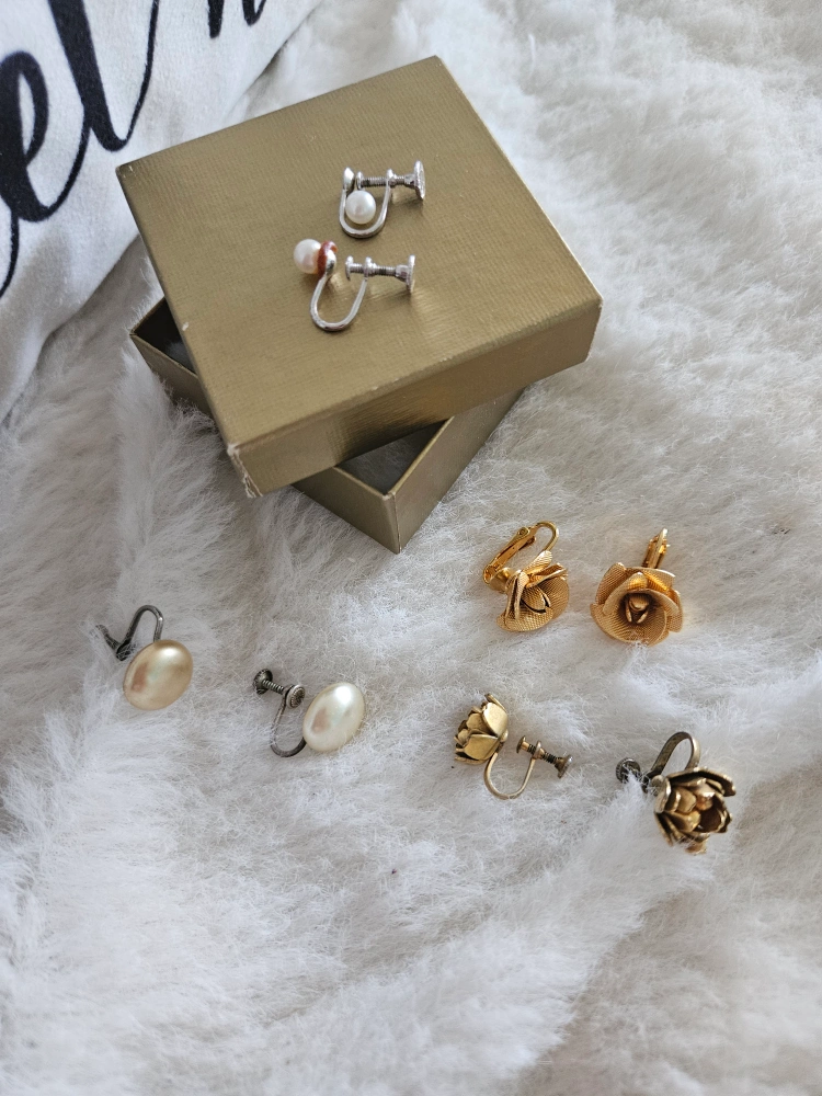 A selection of vintage clip-on earrings! There are several pairs with different designs. Some are gold-toned rose designs, and others are pearl-style. They come in a box too! *priced as a bundle I have been cleaning out our hobby/storage room and have a lot to list. Some items have been purchased from other online sales, garage sales, auctions ect so can not guarantee it comes from smoke or pet free sorry. Please take a look at other listings and put together a bundle for great savings 🥰 Pick up is Eglinton Ave/ Markham rd area.