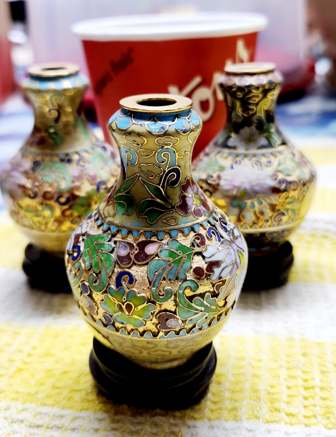 Selling a set of three beautiful vintage cloisonné vases! These are small, decorative vases with intricate floral designs in various colours and gold detailing. They each come with a small black wooden stand. Perfect for adding a touch of elegance to any room