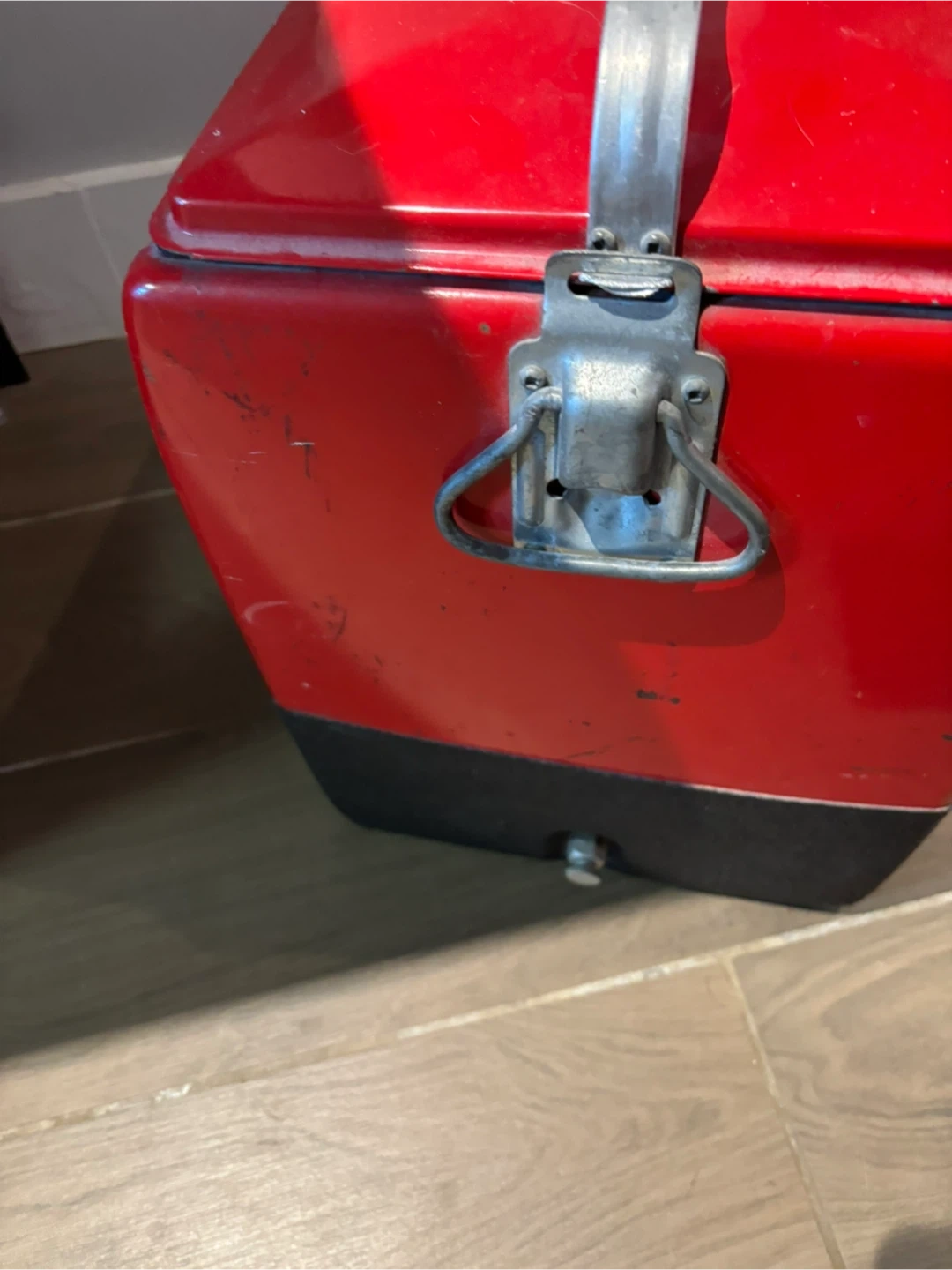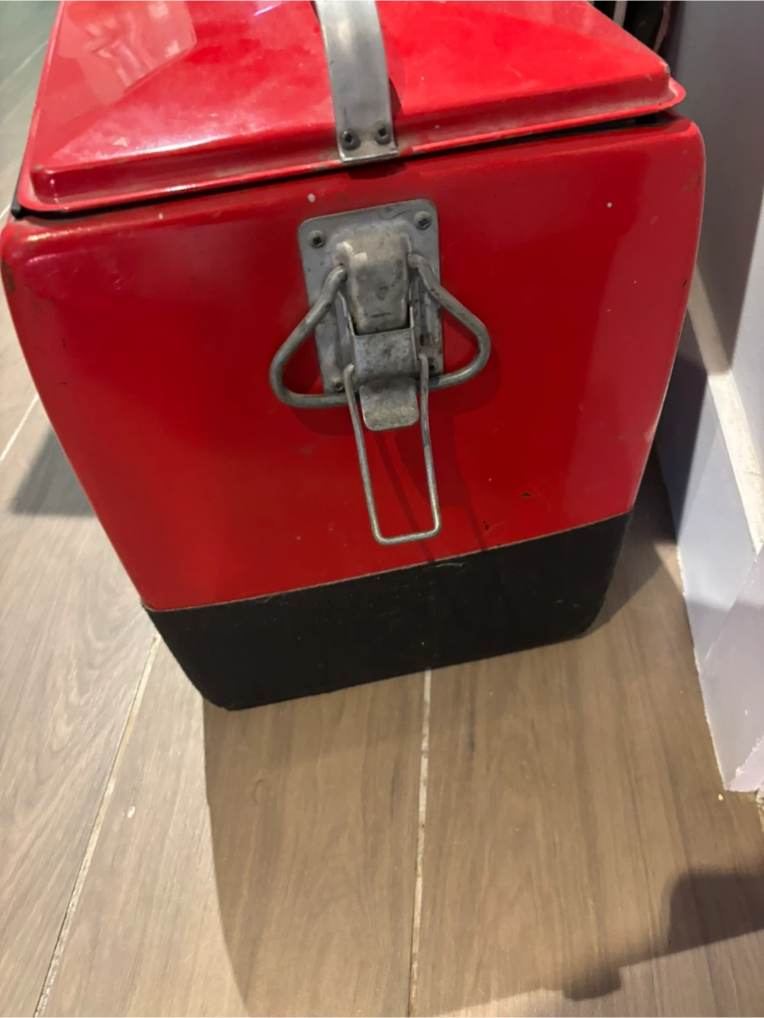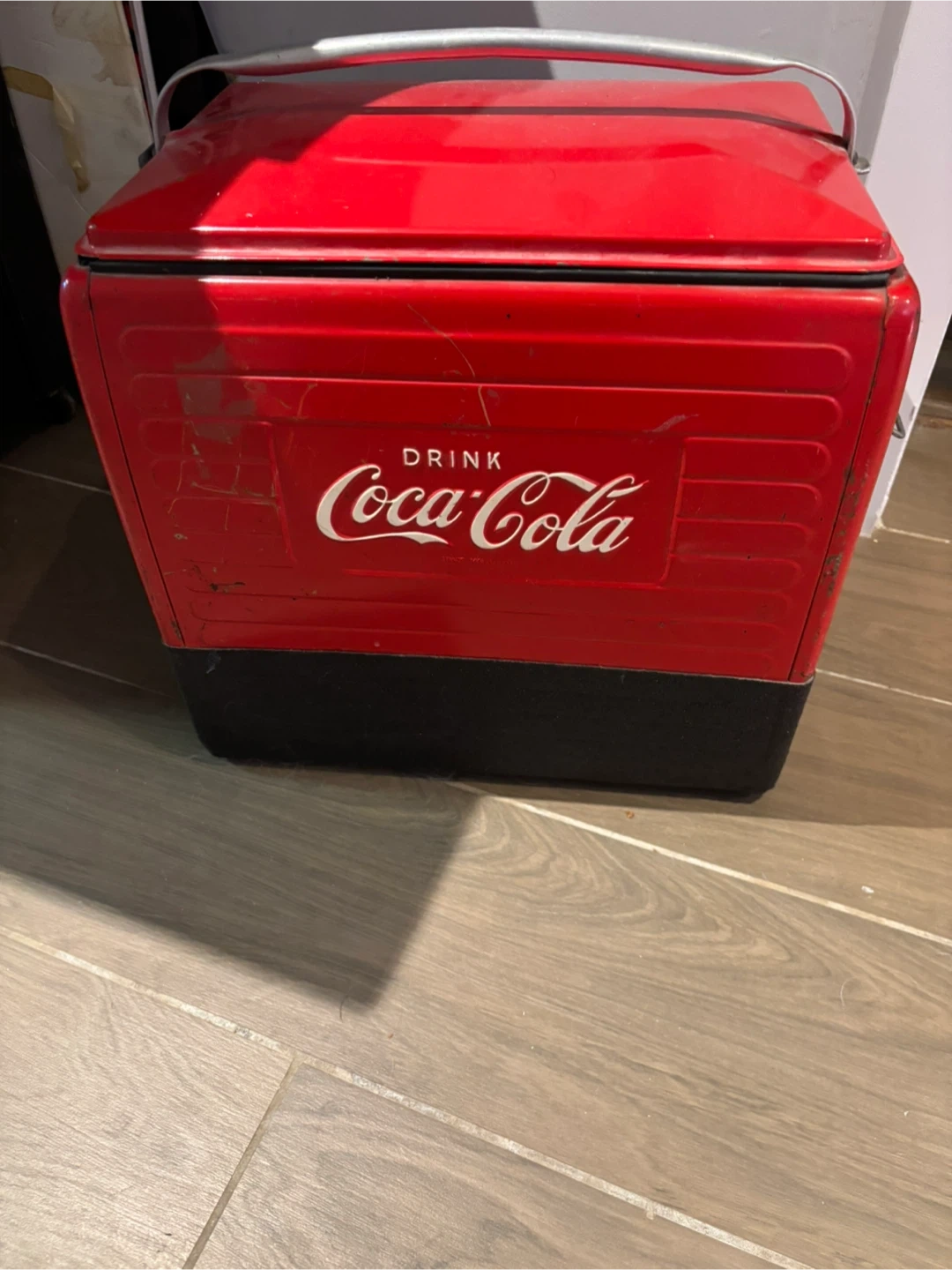 Selling a vintage Coca-Cola cooler! It's red and black with the classic Coca-Cola logo. It's got some wear and tear, but it's still a great piece for any collector or for keeping your drinks cold on a hot day