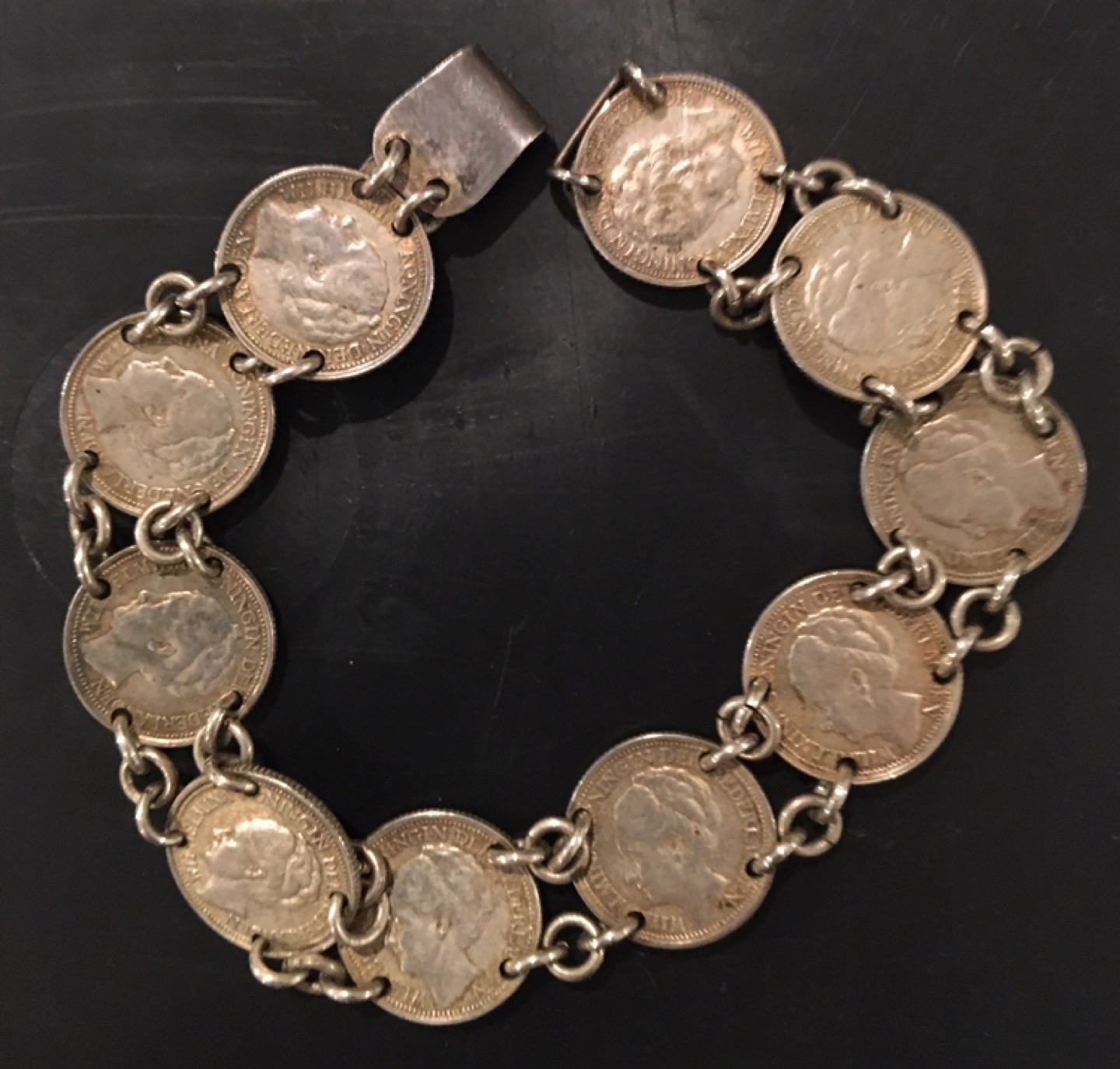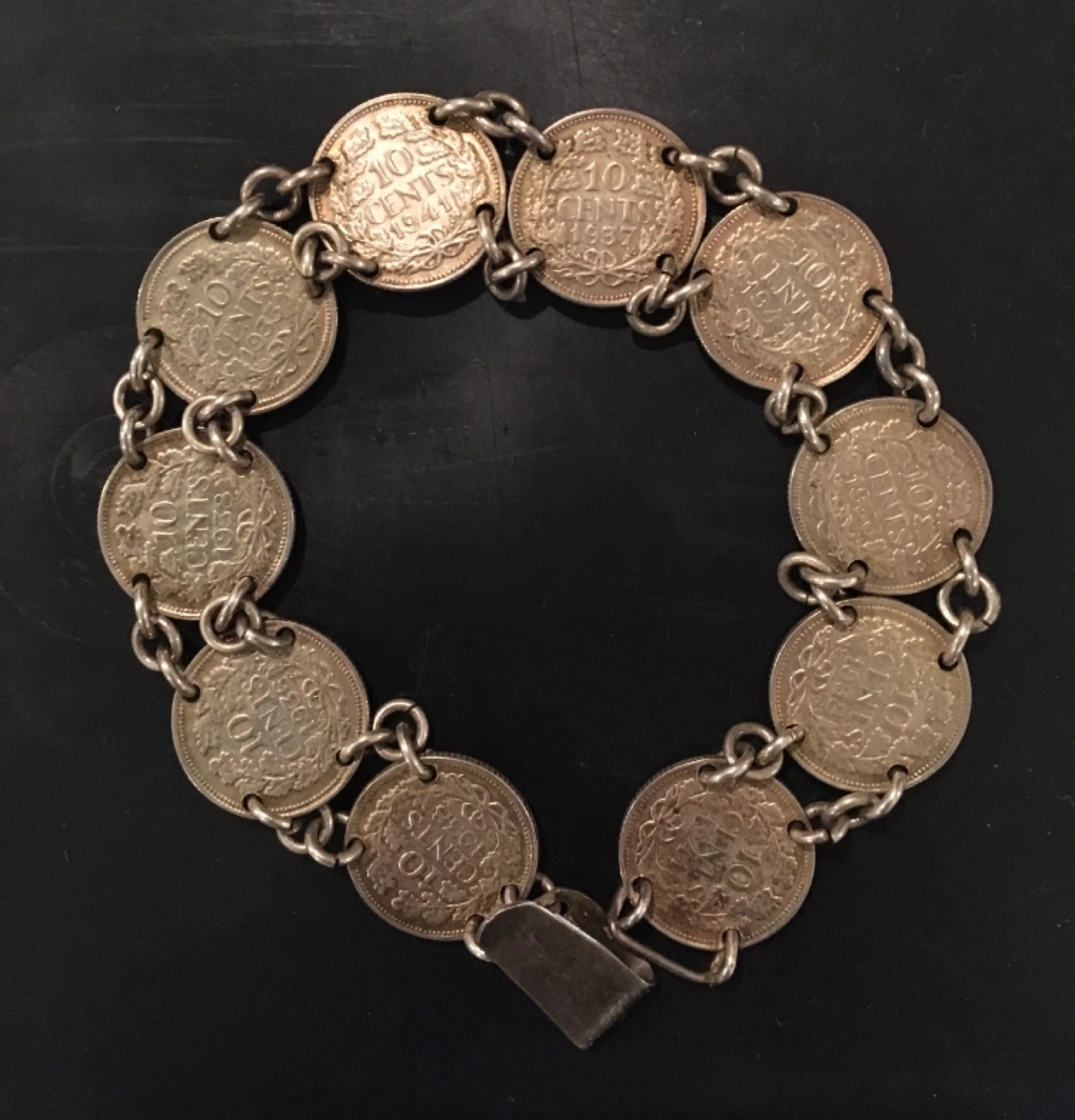 Vintage silver antique dime bracelet featuring old dimes from the 1930’s and 1940’s. Please see pics for dates. Thanks and please check out my other ads!