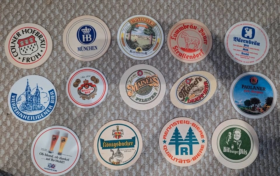 Mostly new condition - priced individually, but discounted for bulk. ⬜ SQUARE: Reichelbräu – Edelherb (das Pils-Juwel) (Kulmbach, Germany) • Classic 1970s/80s style, metallic ink. $3 Binding Bier (Frankfurt am Main, Germany) • Features horse team illustration, c. 1970s–80s. $3 Leiner Flößer Pils (Förtschendorf, Bavaria, Germany) • Exportbierbrauerei motif with historical figure. $5 Dressler Bier – “Seit 1871” (Bremen, Germany) • Market square illustration, traditional style. $3 Adambrau – Innsbruck, Tirol, Austria • Tiroler Bier, with medal awards (Paris 1979, Amsterdam 1981, Lissabon 1985). $5 Warsteiner – “Eine Königin unter den Bieren” (Warstein, Germany) • Iconic Warsteiner crown logo. $3 🔴 CIRCLE: Cölner Hofbräu Früh (Kölsch) – Cologne, Germany • Iconic Kölsch brewery $5 HB München (Hofbräuhaus München) – Munich, Germany • One of the most famous breweries worldwide. $3 Kapsreiter Landbier – Schärding, Austria • Historic brewery (founded 1590, now defunct). $4 Lammbrau-Daur Strullendorf – Bavaria, Germany • Franconian brewery. $3 Bärenbräu Pils – Bavaria, Germany Classic regional pils coaster. $3 Vierzehnheiligen Bier (Alte Klosterbrauerei) – Bavaria, Germany • Monastic brewery $3 Riegeler Bier (Seit 1834) – Baden-Württemberg, Germany • Long history, nice crest design. $3 Maisel’s Pilsner – Bayreuth, Bavaria, Germany • Known for their wheat beers. $5 Maisel’s Dampfbier – Bayreuth, Bavaria, Germany $5 Paulaner Hefe-Weißbier Naturtrüb – Munich, Germany $3 Hacker-Pschorr Weißbier (“Ob blond, ob dunkel…”) – Munich, Germany • Popular Brewery $2 Königsbacher – Koblenz, Germany $2 Rennsteig-Biere (Qualitäts-Biere) – Thüringen, Germany $2 Bitburger Pils – Bitburg, Germany $2