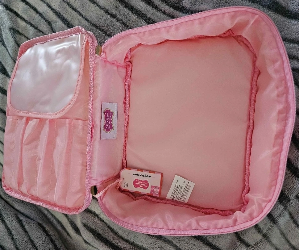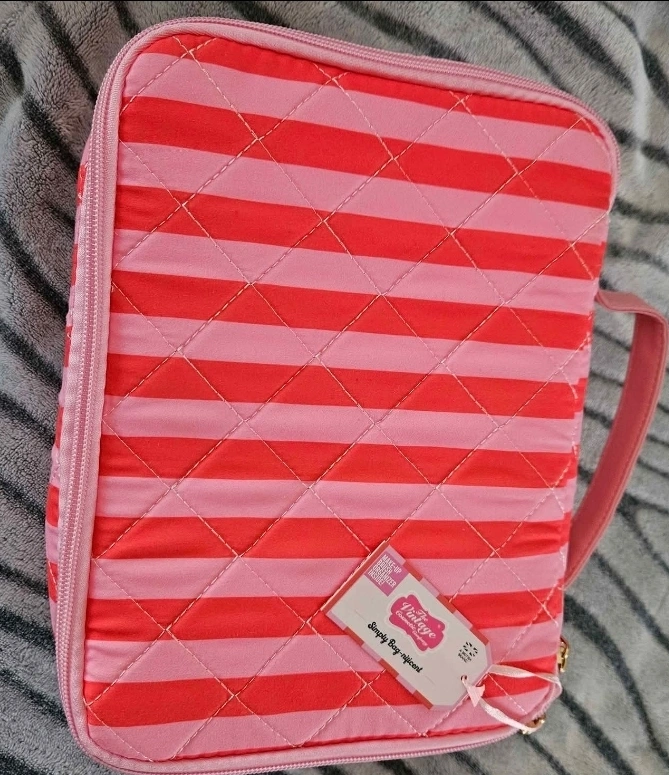 Selling a brand new makeup bag from The Vintage Cosmetics Company! It's pink with red stripes and has a quilted pattern. Perfect for storing all your beauty essentials!