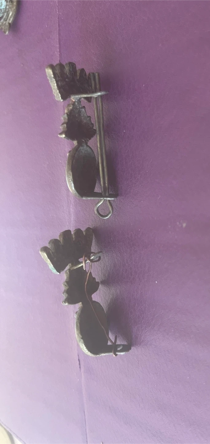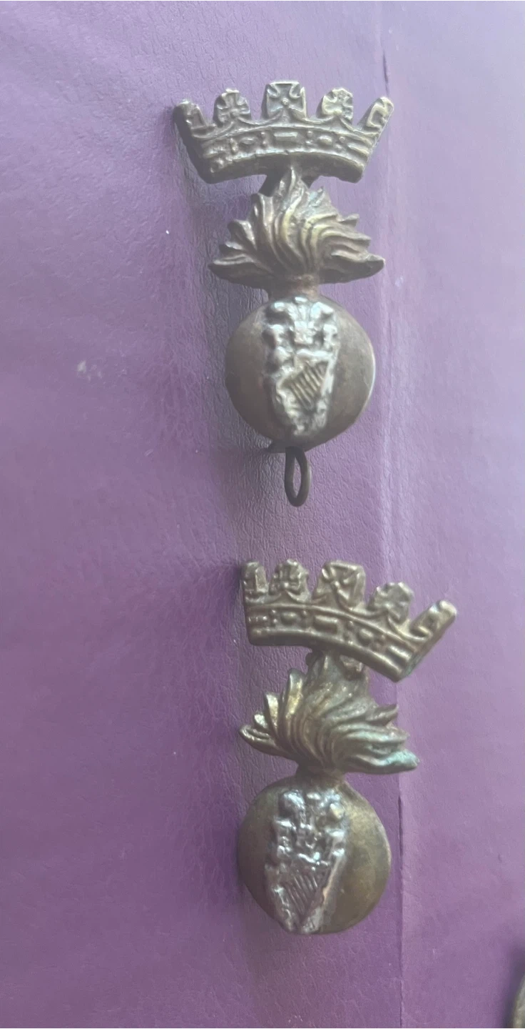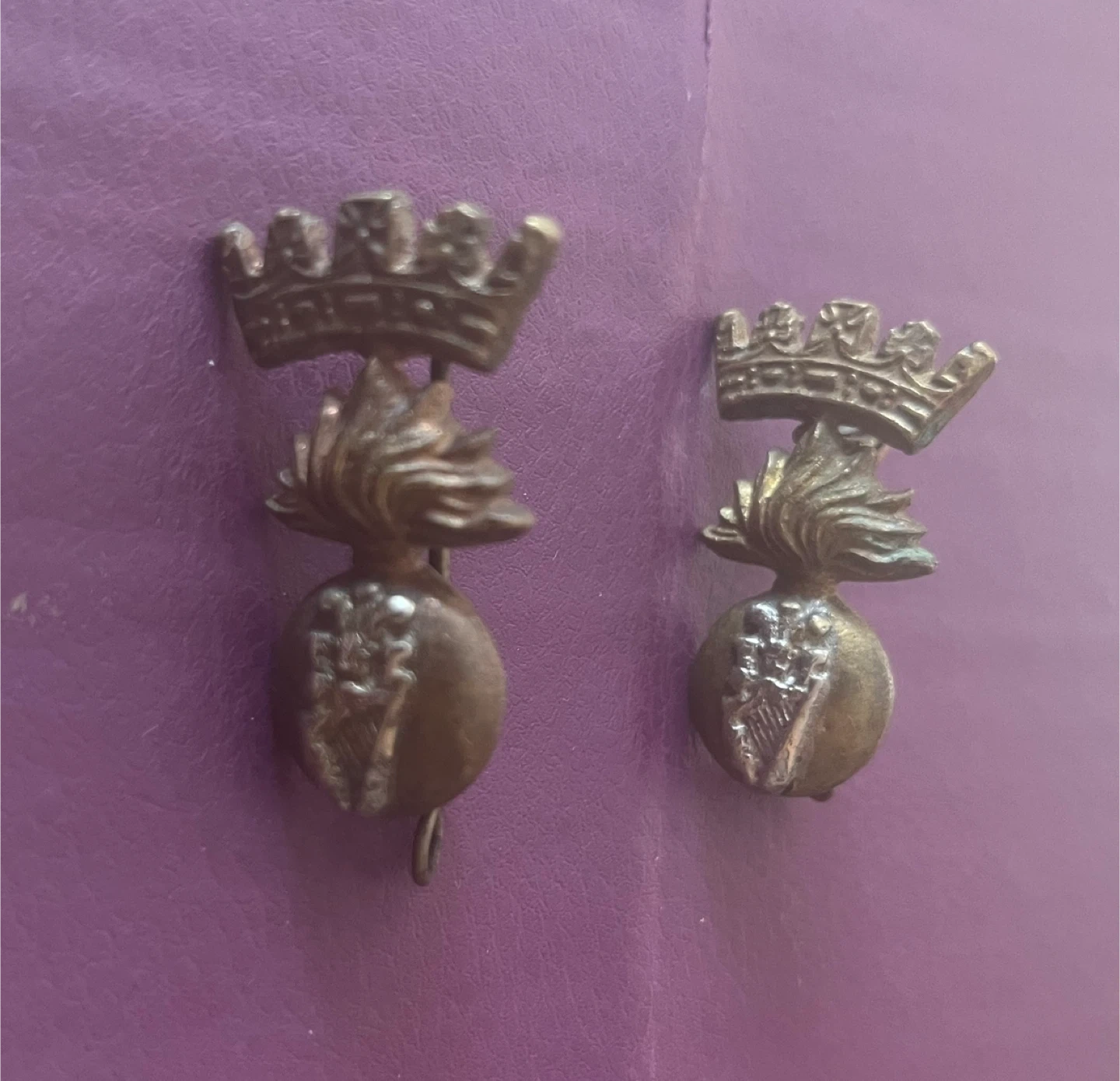 Selling a pair of vintage brooch pins. They feature a crown above a harp design. Both are in good condition for their age and would make a great addition to any collection!