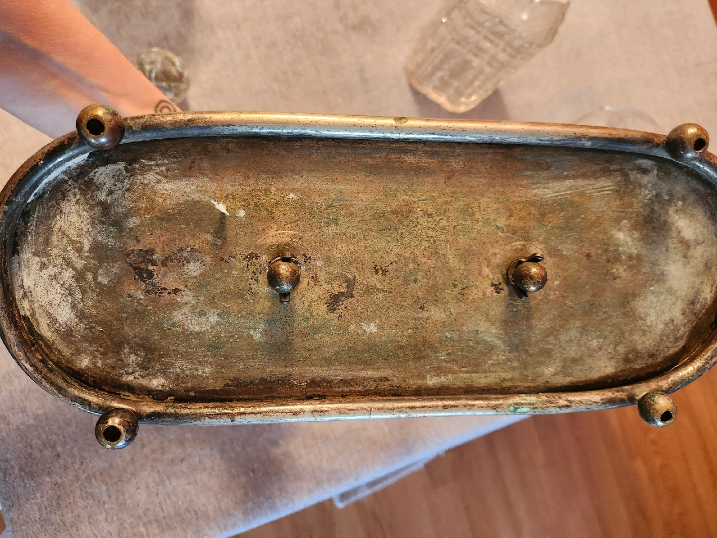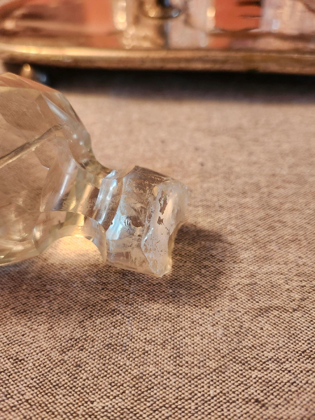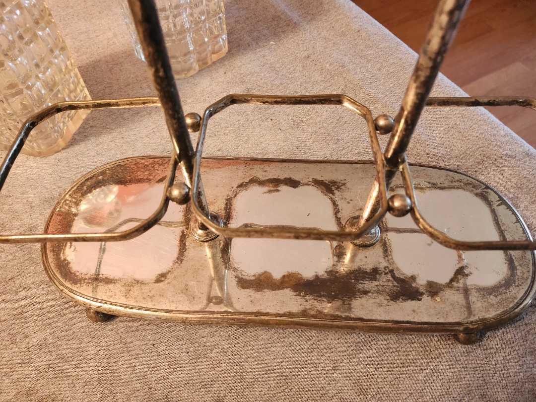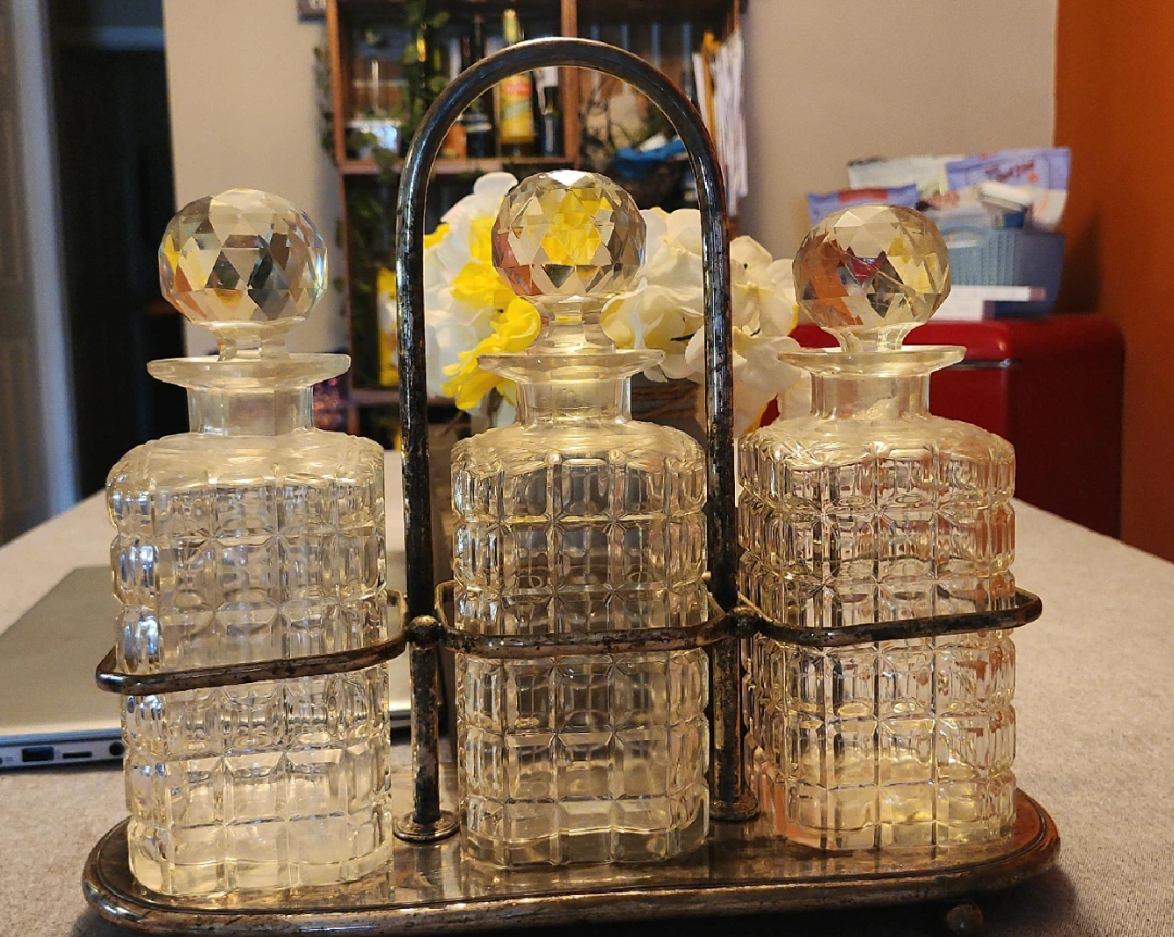 Selling a vintage crystal decanter set, complete with a silver-toned stand. It features three crystal bottles with decorative stoppers. There is some tarnish on the silver stand and a chip on one of the stoppers, as shown in the photos. It would be a beautiful addition to your home bar or collection!