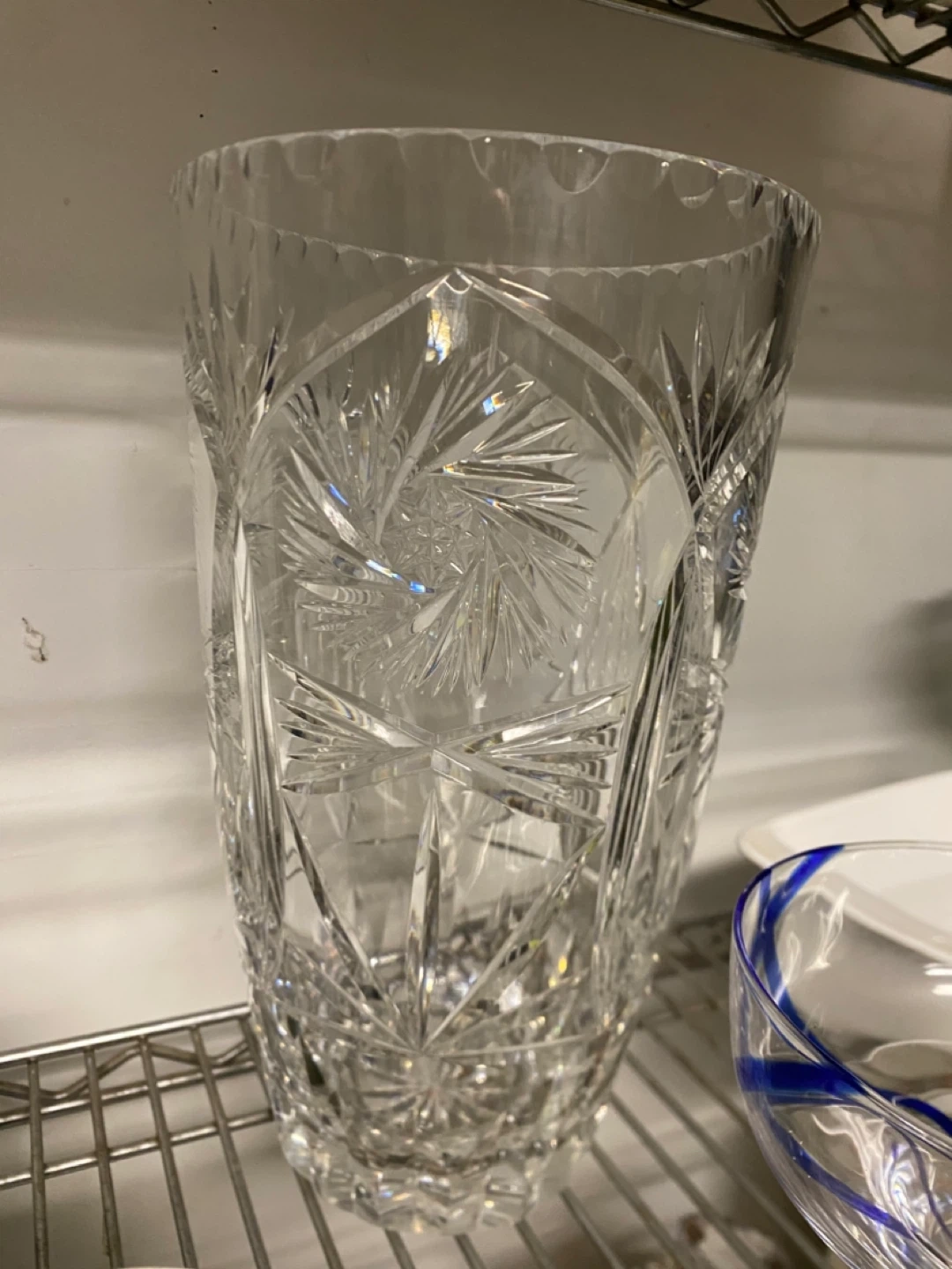 Beautiful large vintage crystal vase with intricate starburst design Perfect for displaying flowers or as a decorative piece This is one of the most beautiful and large vases I have seen.