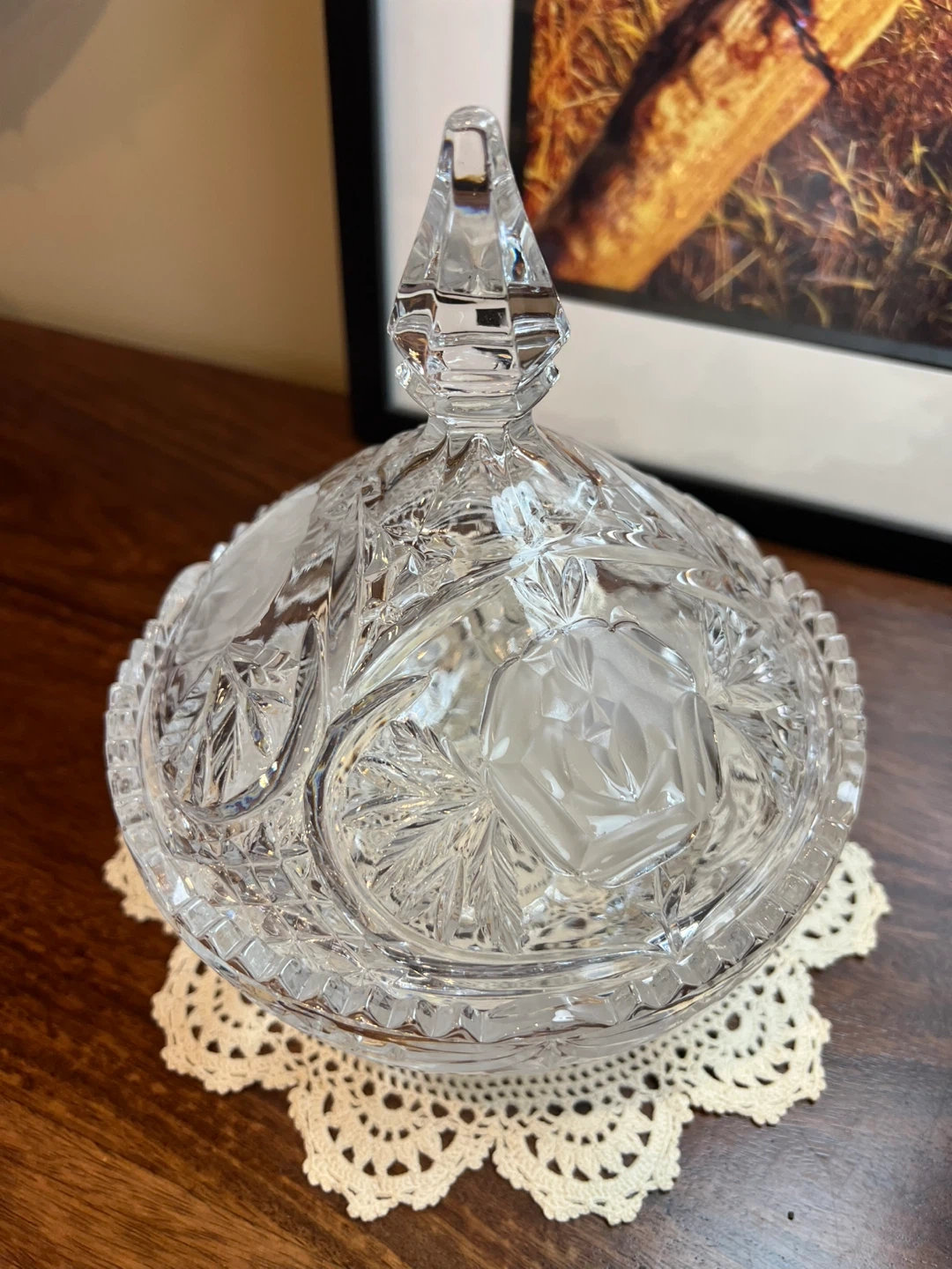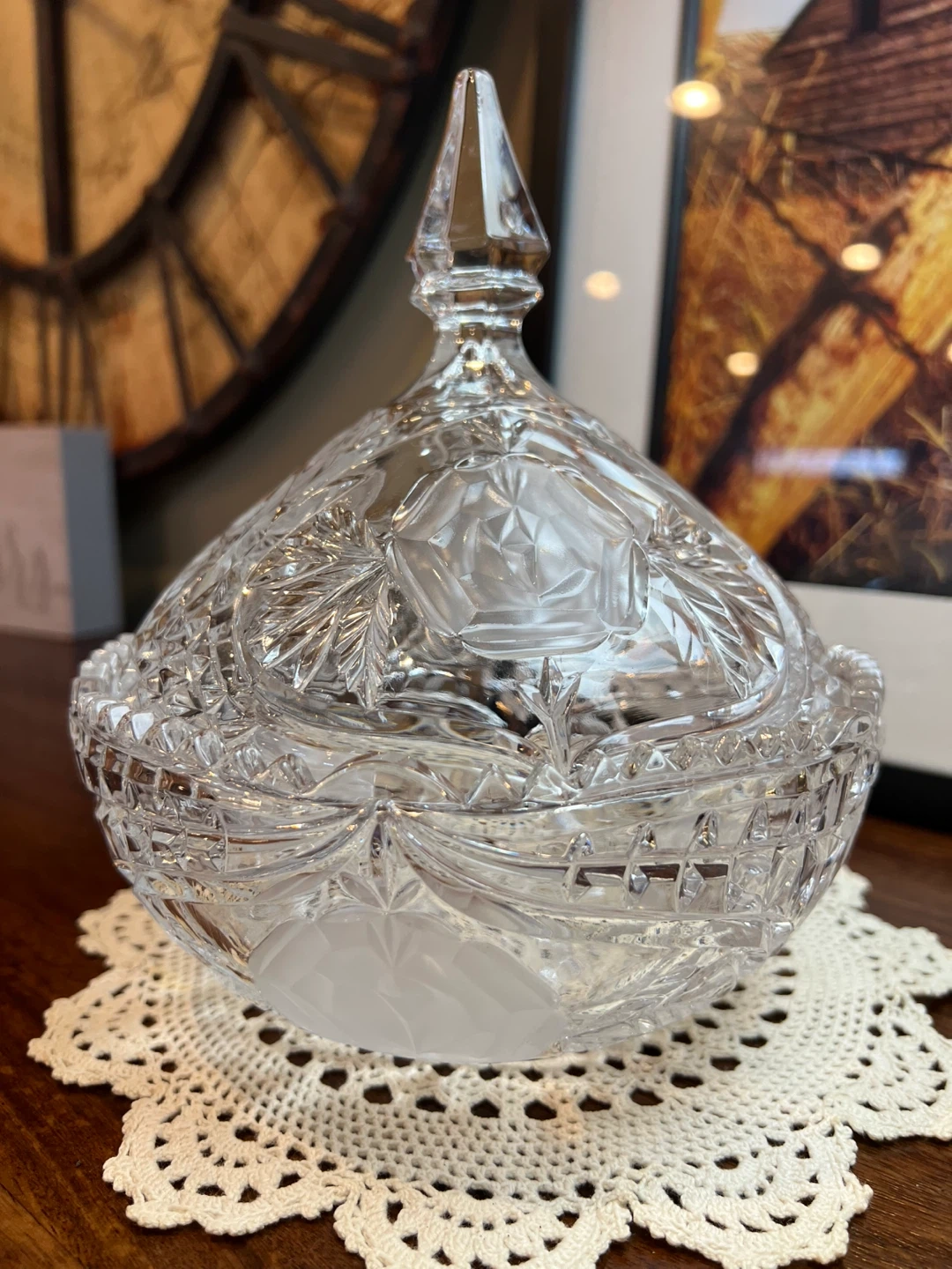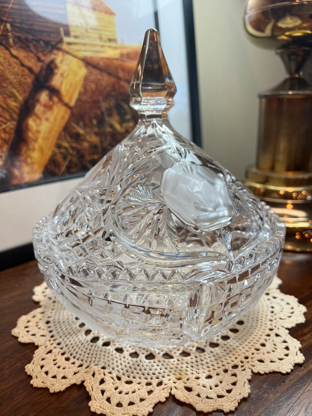 Vintage crystal candy dish with a lid, featuring cut glass designs and a frosted rose details Beautiful light reflecting properties Origin and exact age unknown Mint condition Can be use for storing candies, nuts or as a decorative accent… 8.5” total high 7” bowl diameter Asking $25 Interested? Messsge me and please check my other listings…
