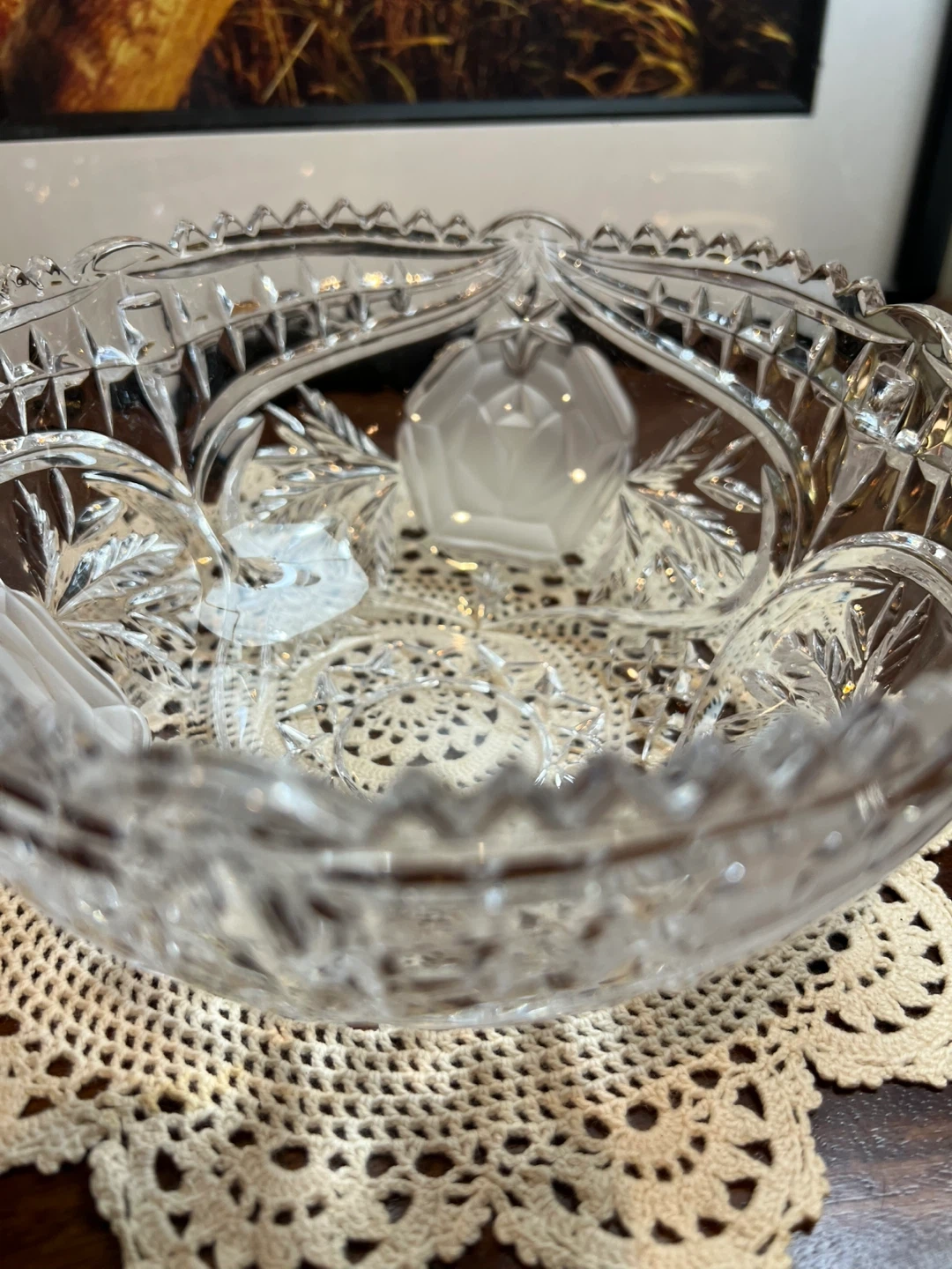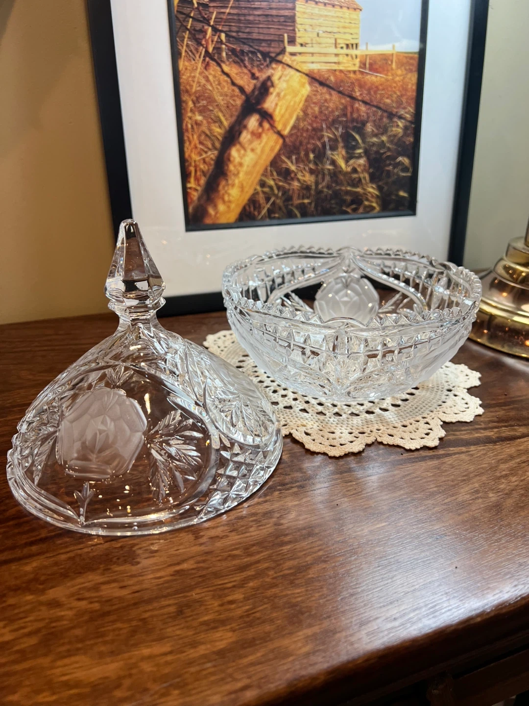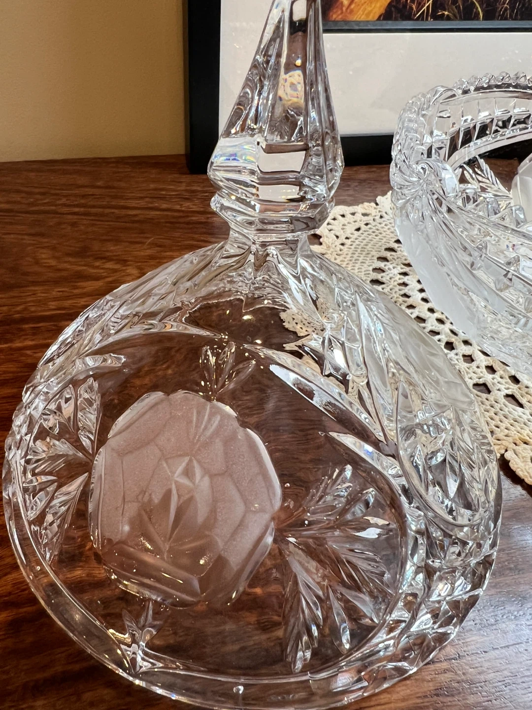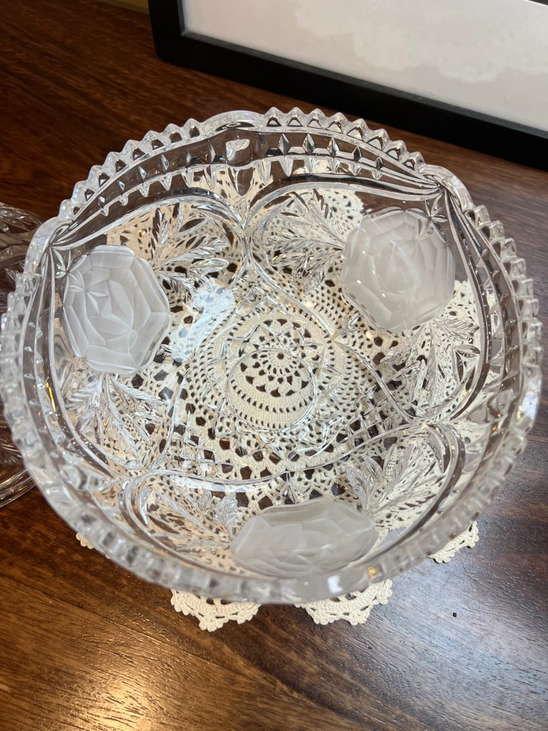 Vintage crystal candy dish with a lid, featuring cut glass designs and a frosted rose details Beautiful light reflecting properties Origin and exact age unknown Mint condition Can be use for storing candies, nuts or as a decorative accent… 8.5” total high 7” bowl diameter Asking $25 Interested? Messsge me and please check my other listings…