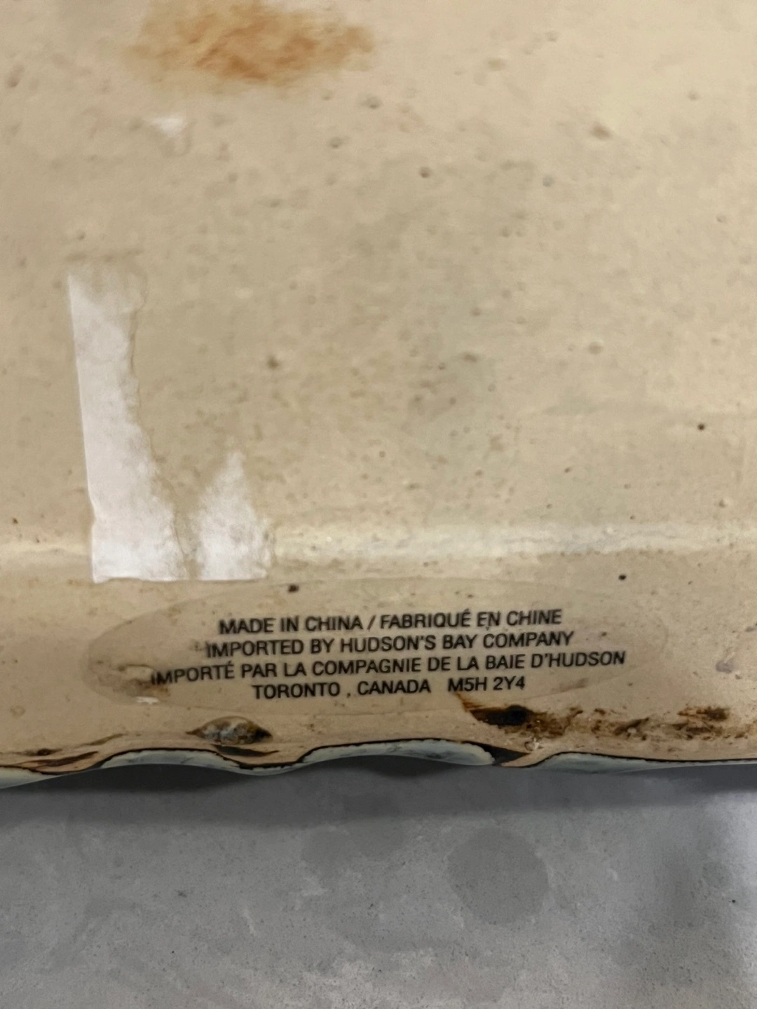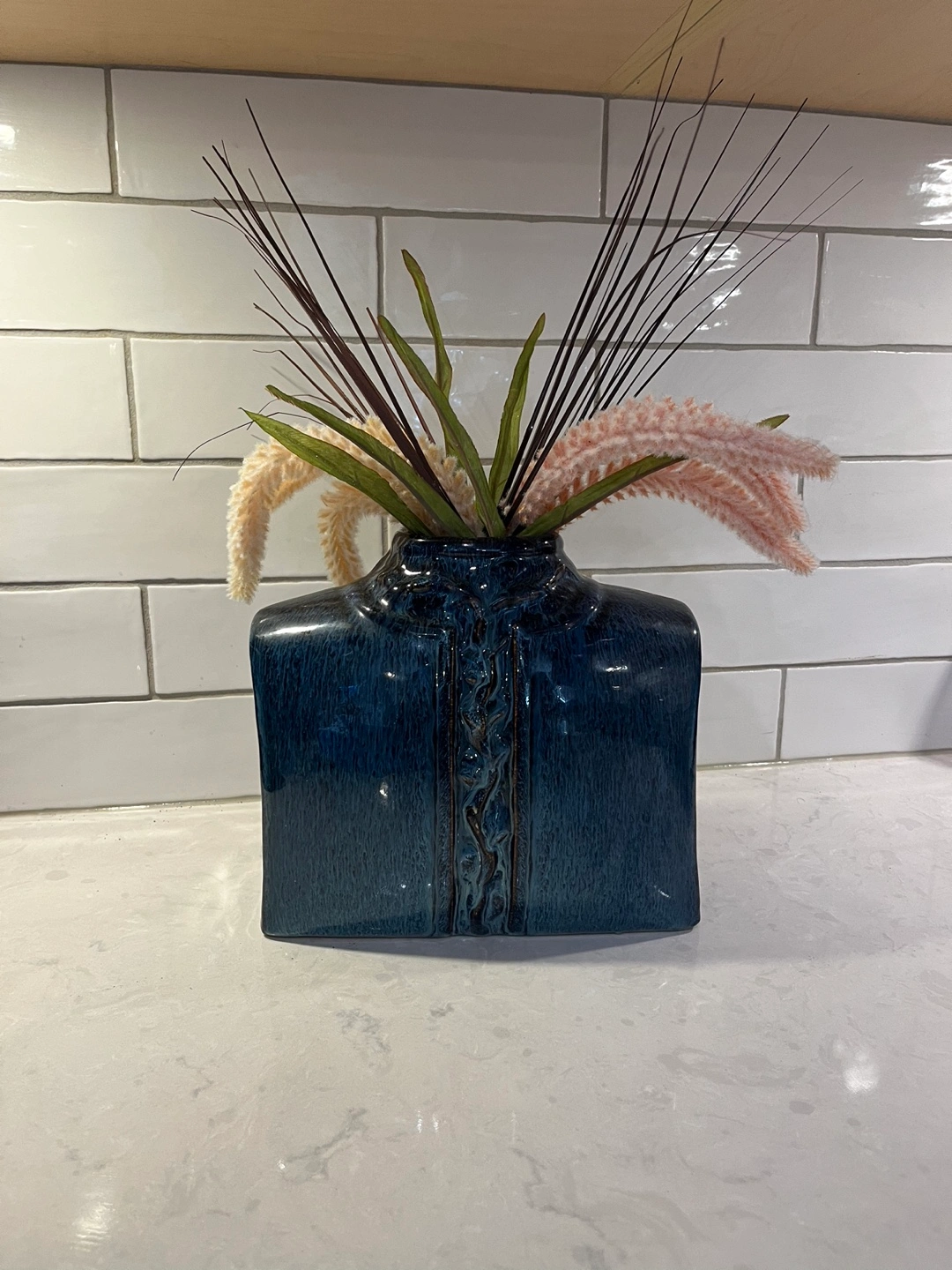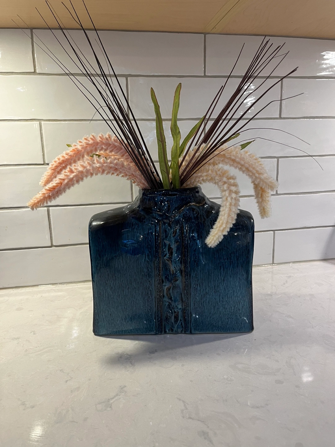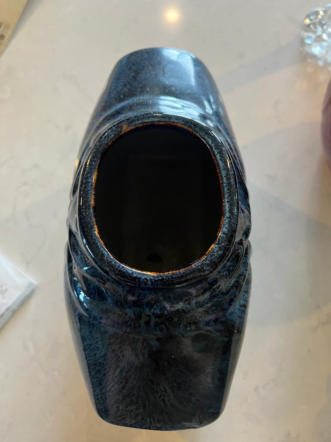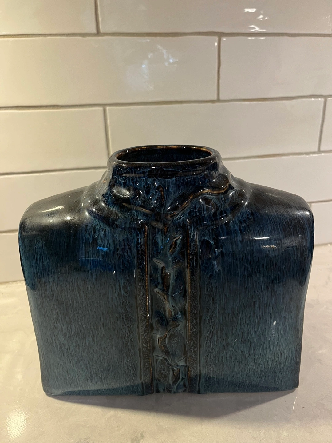 Beautiful dark blue ceramic vase. Shaped like a shirt. Imported by Hudson's Bay Company. Perfect for adding a touch of style to any room.