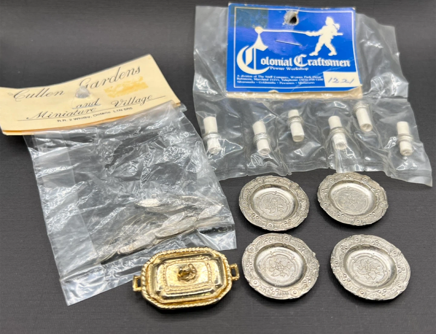 I have a collection of miniature village items from Cullen Gardens and Colonial Craftsmen. These are perfect for adding detail to your miniature scenes. Includes knives, plates, and other accessories to enhance your miniature village or dollhouse