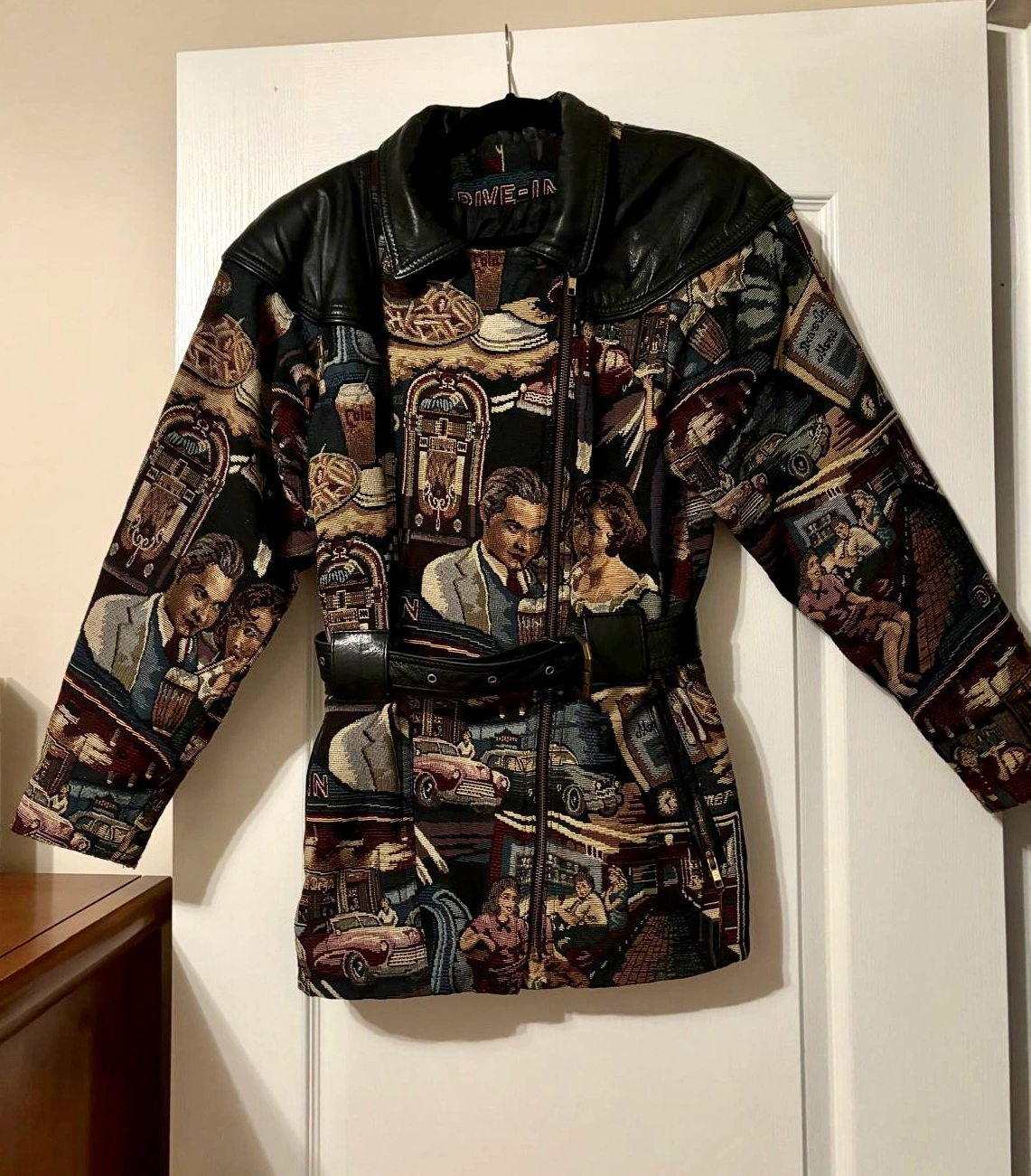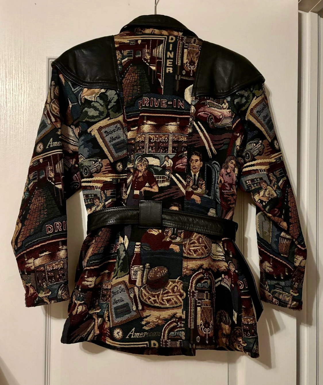 This is a vintage tapestry leather jacket with a drive-in diner theme. It features black leather shoulders and a black leather belt. It is in excellent conditions. Size S