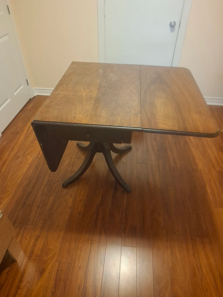 Selling a vintage drop leaf dining table. This table features a beautiful wood grain and a classic design. Perfect for smaller spaces or as an accent piece in a larger dining area. It's in good condition and ready for a new home!