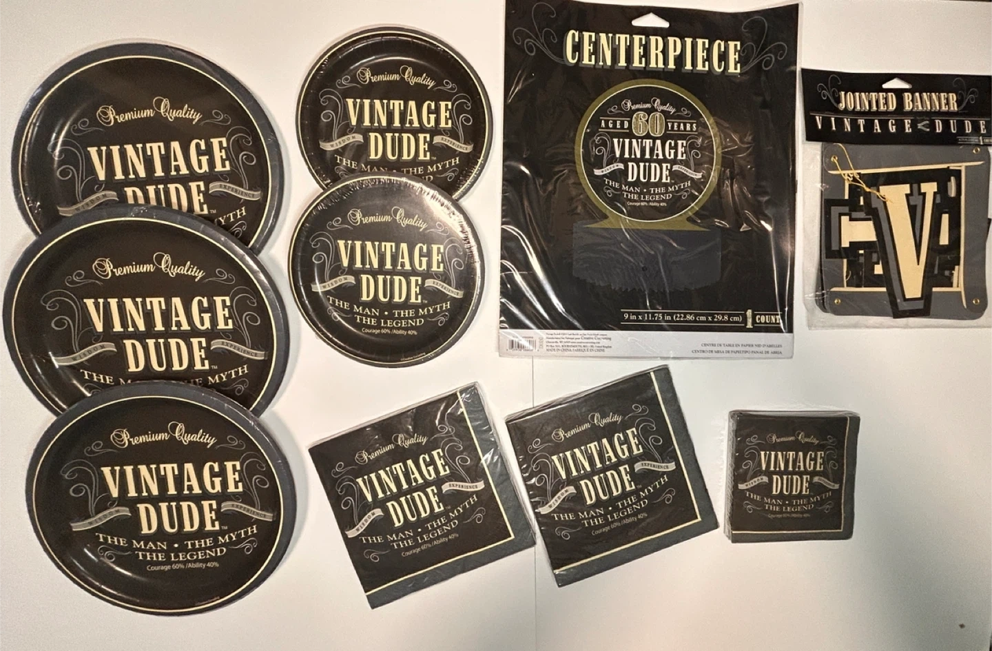 Get ready to celebrate a milestone with this complete Vintage Dude party set! Includes plates, napkins, a centerpiece, and a jointed banner, all with a fun 'Vintage Dude' theme. Perfect for a 60th birthday bash!