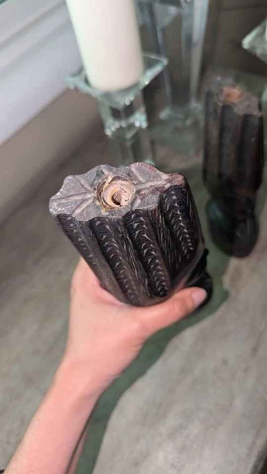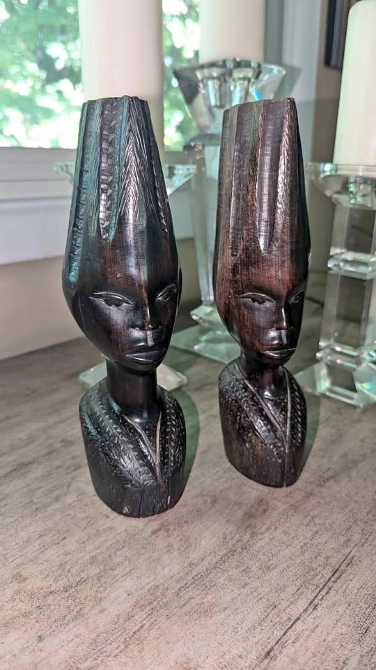 Beautiful hand-carved vintage ebony wooden busts Candlestick Holders, depicting male and female figures with tall textured headdresses and intricate detailing. Likely carved in East Africa (mid-century era). Solid , heavy, with lovely patina and subtle grain variation. Each stands approx. 9" tall.