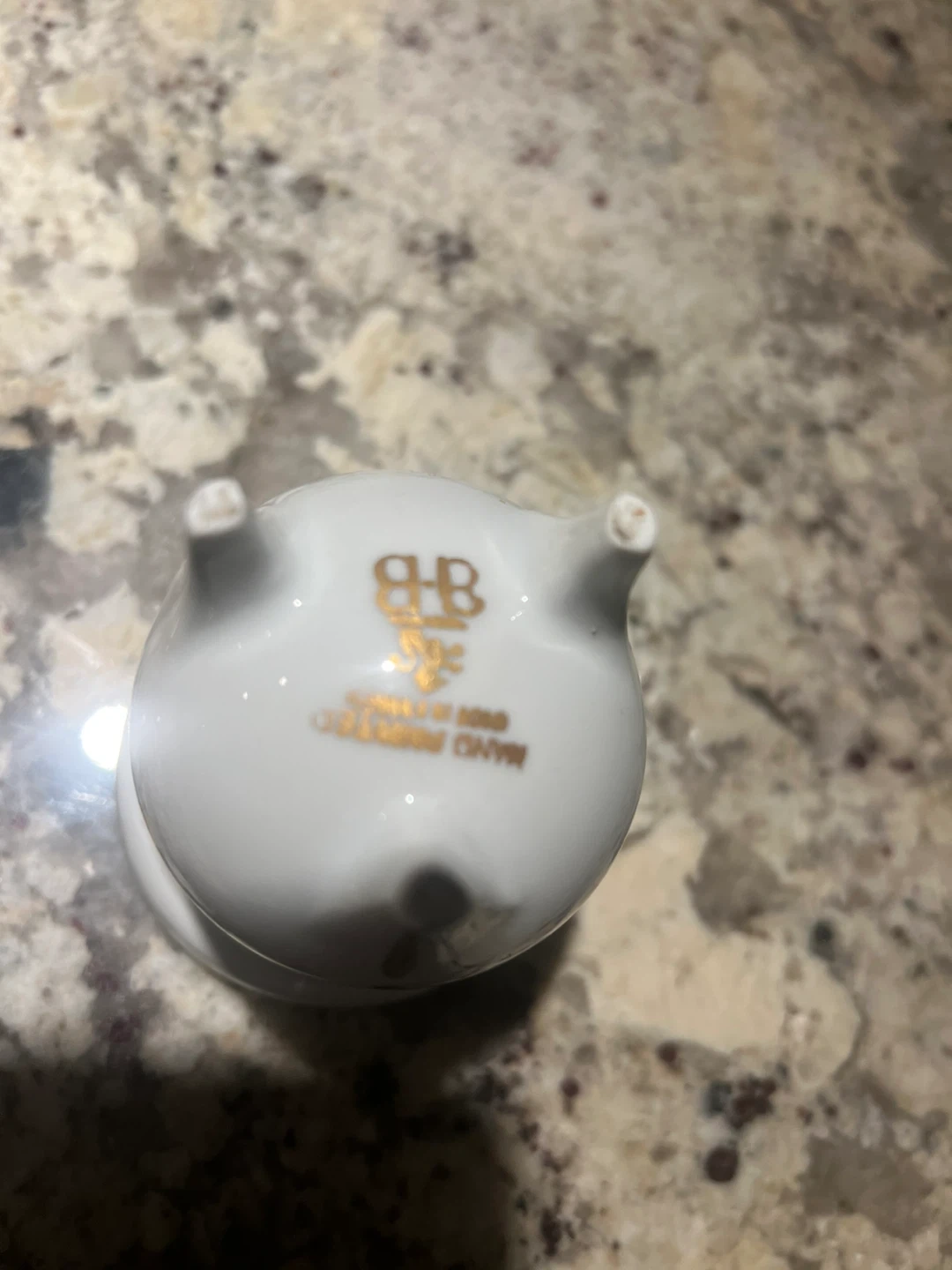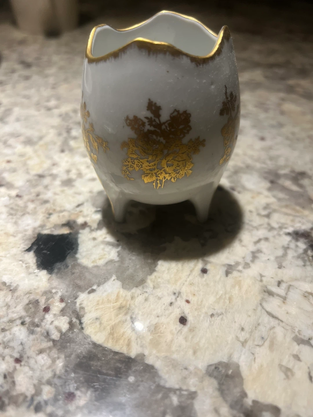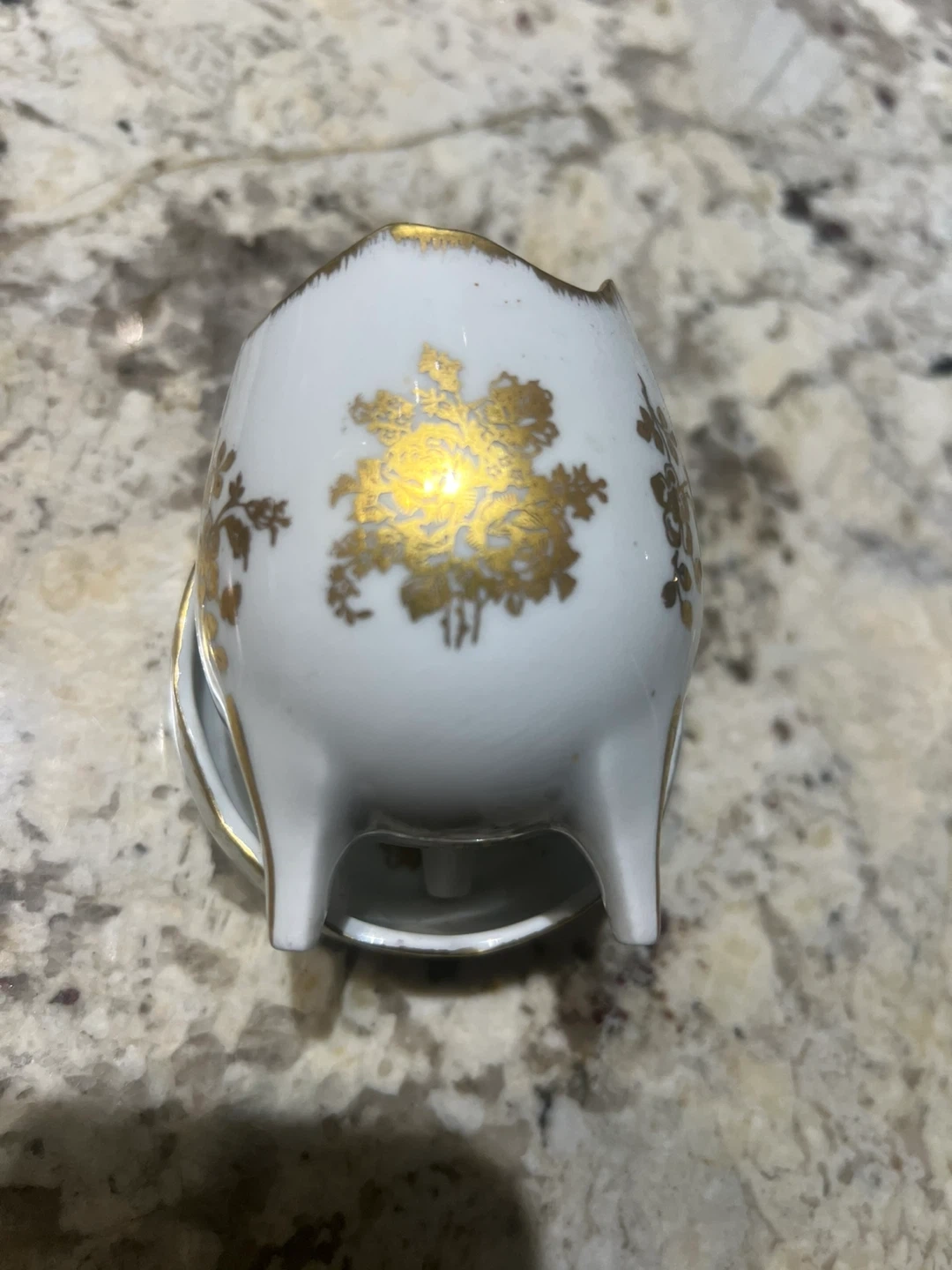 Selling a vintage egg cup with a matching saucer! It's white with a beautiful gold floral design and gold trim. The egg cup has three little legs. It's in great condition and would make a lovely addition to your breakfast table or collection