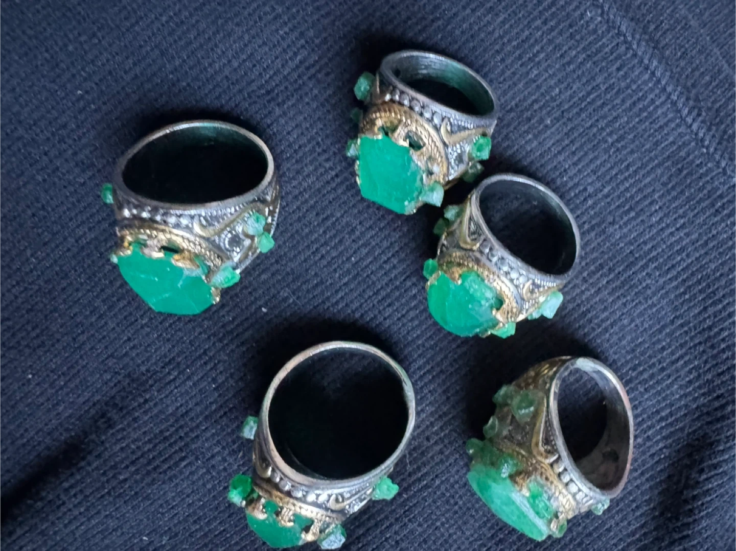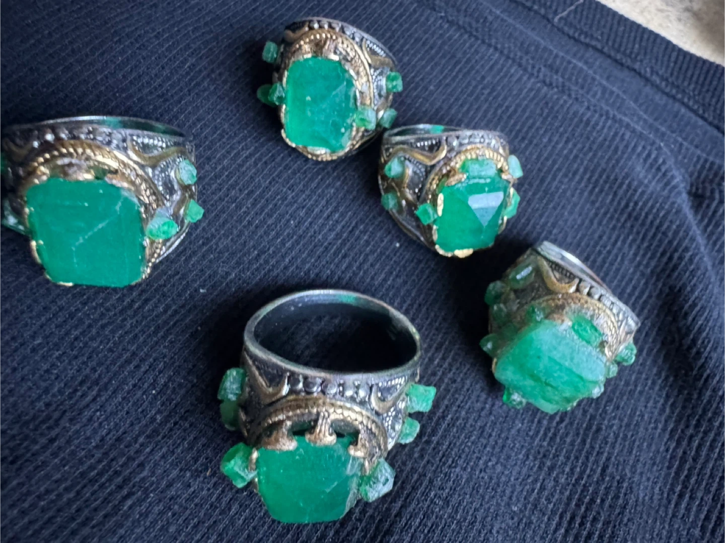 Selling a set of 5 vintage rings, each featuring a vibrant green emerald-like stone. The rings have a unique, ornate design with silver and gold-tone detailing. Perfect for adding a touch of vintage charm to your collection! 90$ each