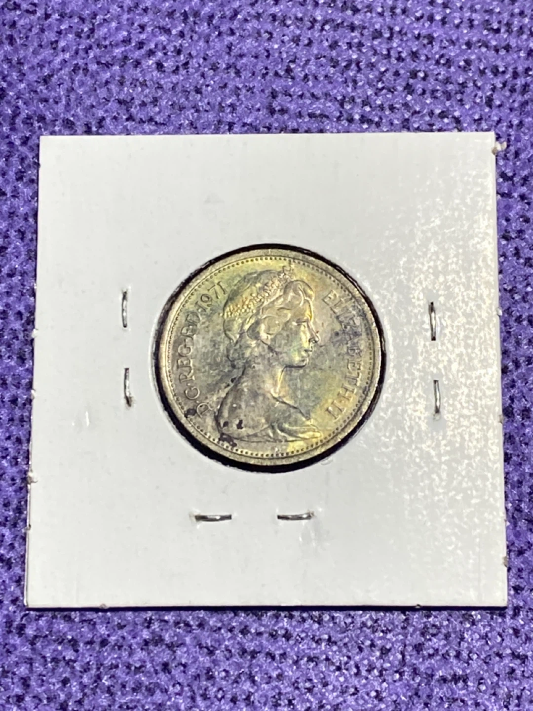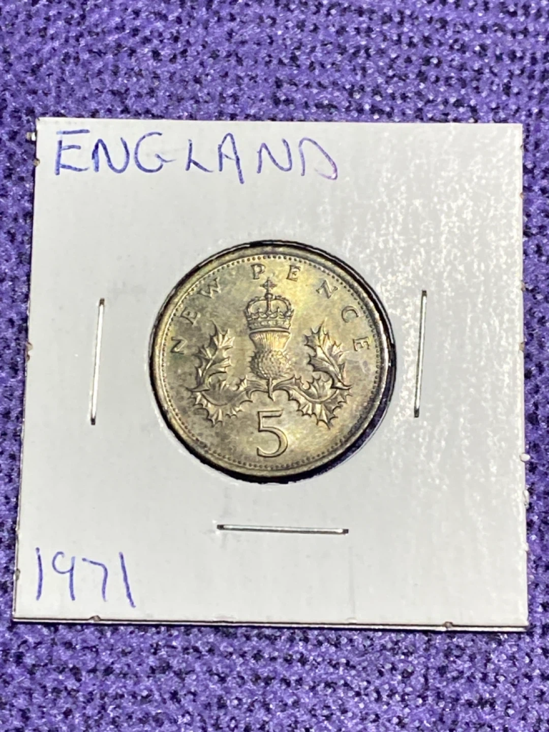 Selling a vintage England 5 New Pence coin from 1971. It features a thistle and crown design on one side and Queen Elizabeth II on the other. A great piece for collectors!