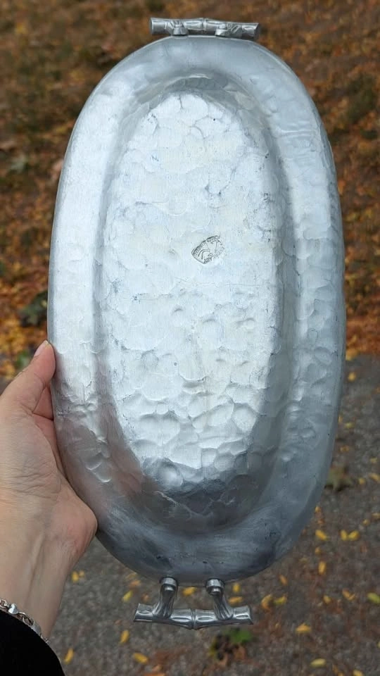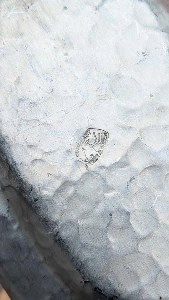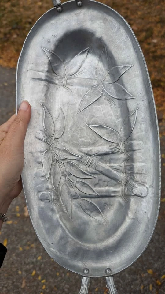 Lovely vintage Everlast Forged Aluminum serving tray featuring a hand-hammered texture and raised bamboo and leaf motif. The tray has elegant bamboo-style handles and the original Everlast Forged Aluminum hallmark on the underside. These trays were crafted in the mid-20th century and are valued for their light yet sturdy construction. Era: c. 1940s–1950s Perfect for serving, displaying fruit, or styling a bar or coffee table with a touch of mid-century charm.