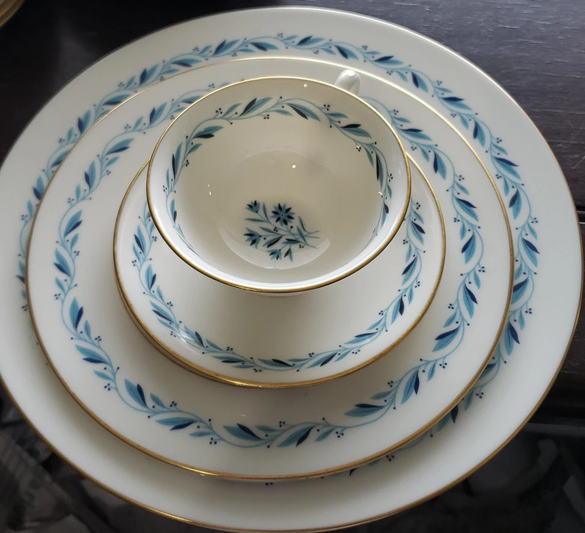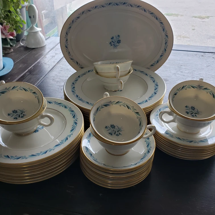 Selling a beautiful vintage fine china set! The set features a delicate blue floral pattern with a gold trim. It includes a dinner plate, salad plate, bread plate, and teacup. Perfect for adding a touch of elegance to your dining experience