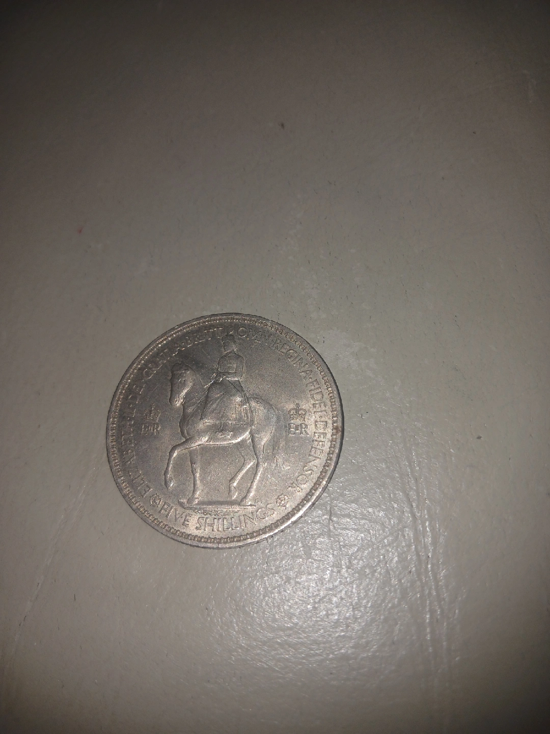 Selling a vintage Five Shillings coin. It features a horse and rider design and the text 'Elizabeth II Dei Gratia Regina F:D: Defensor Fidei'. A nice piece for collectors!