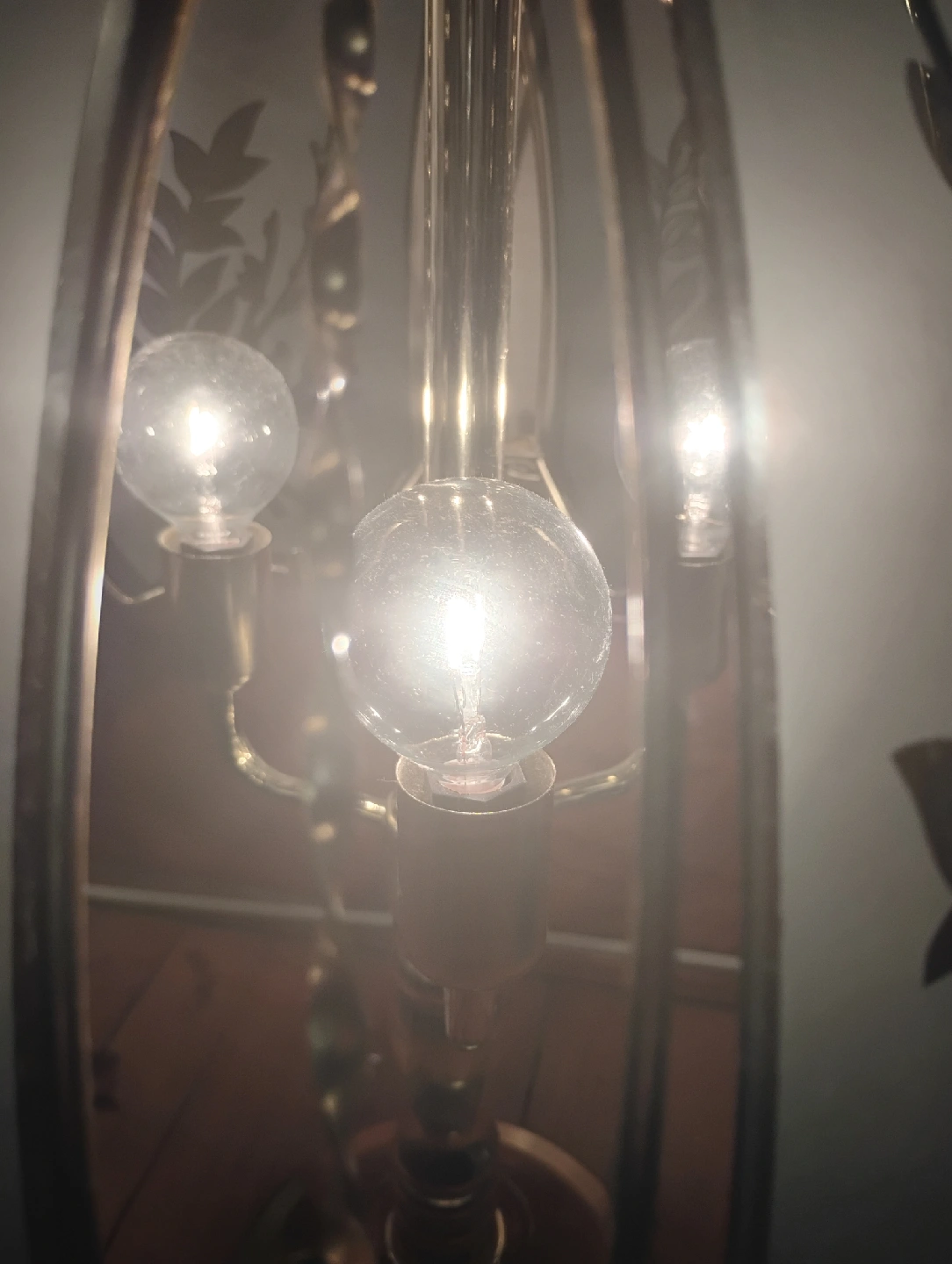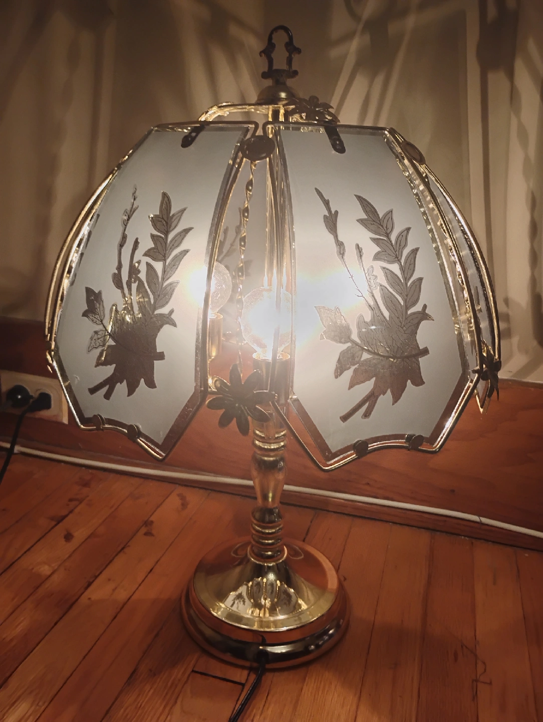 This is a lovely vintage accent lamp that would add a touch of elegance to any room. It features a floral design on the shade and a gold-tone base. It's in great condition and ready to brighten up your space