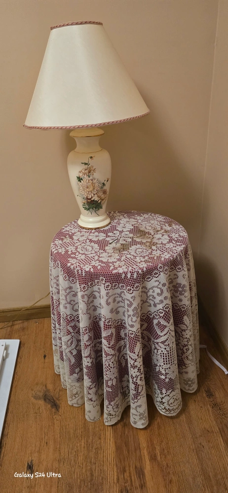 Selling a charming vintage lamp that would look great in any room! It comes with a lovely lace tablecloth that adds a touch of elegance. The lamp features a floral design on the base, and the shade has a delicate trim. Perfect for adding a warm and cozy ambiance to your home