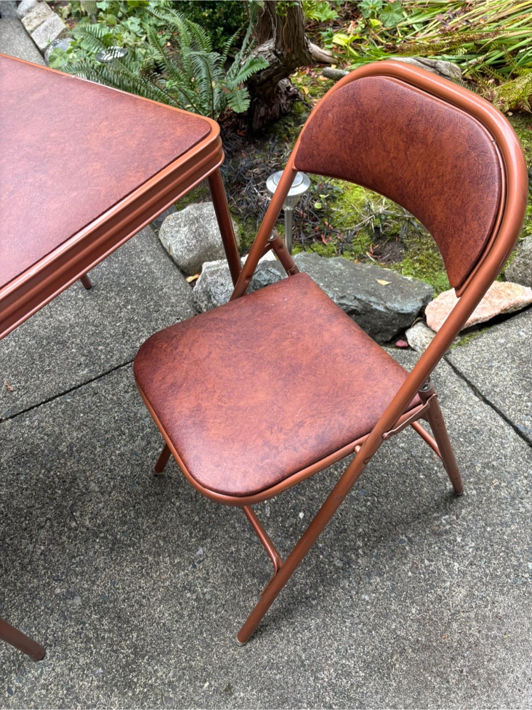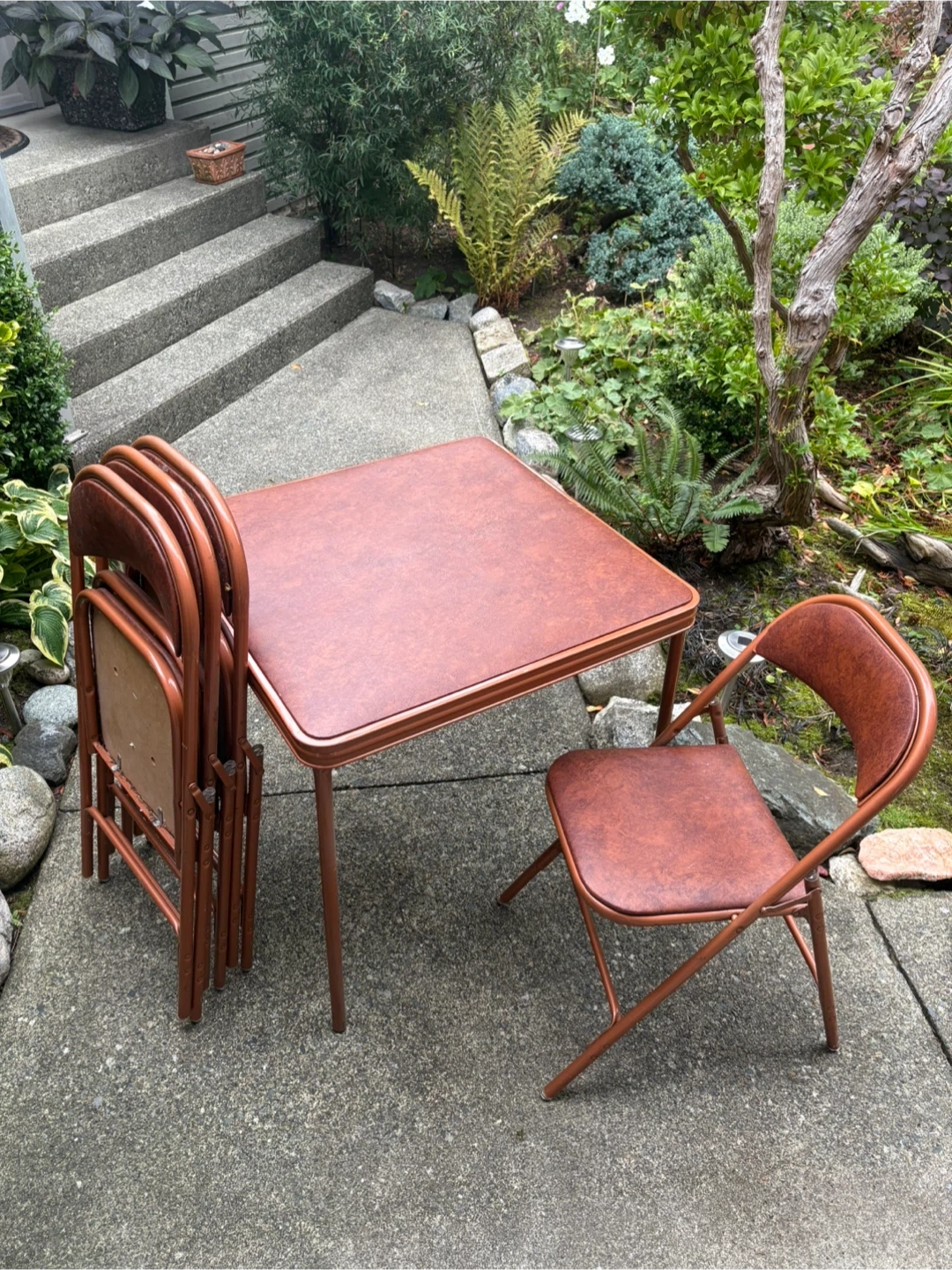 Selling a vintage folding table and chair set. The set is in good condition (other than one chair has a bit of damage). This crib/poker/man cave table set is ready for a new home!