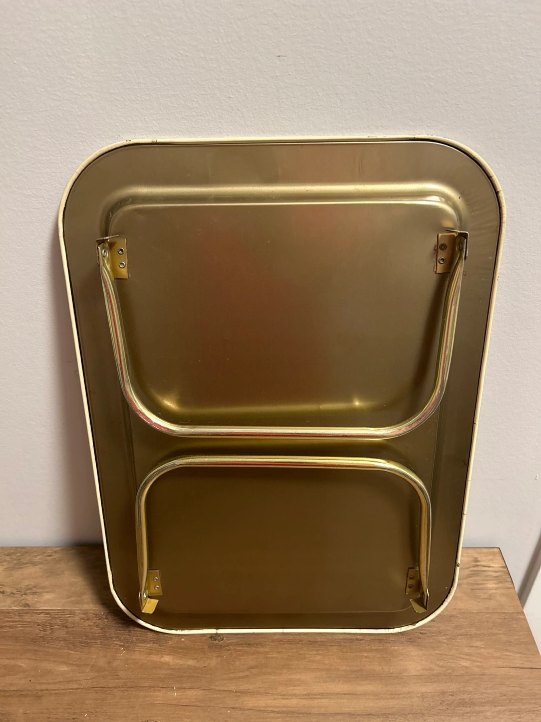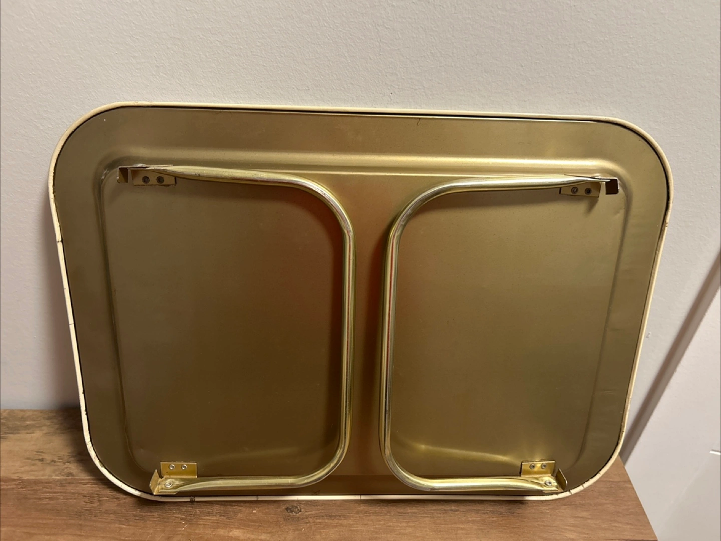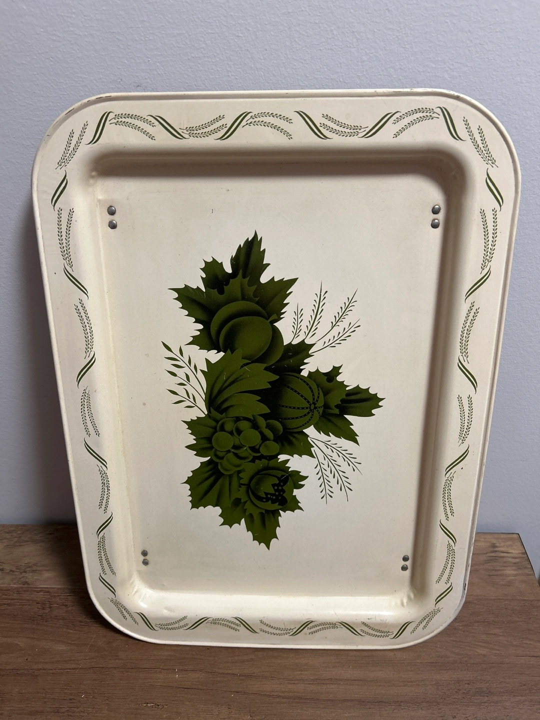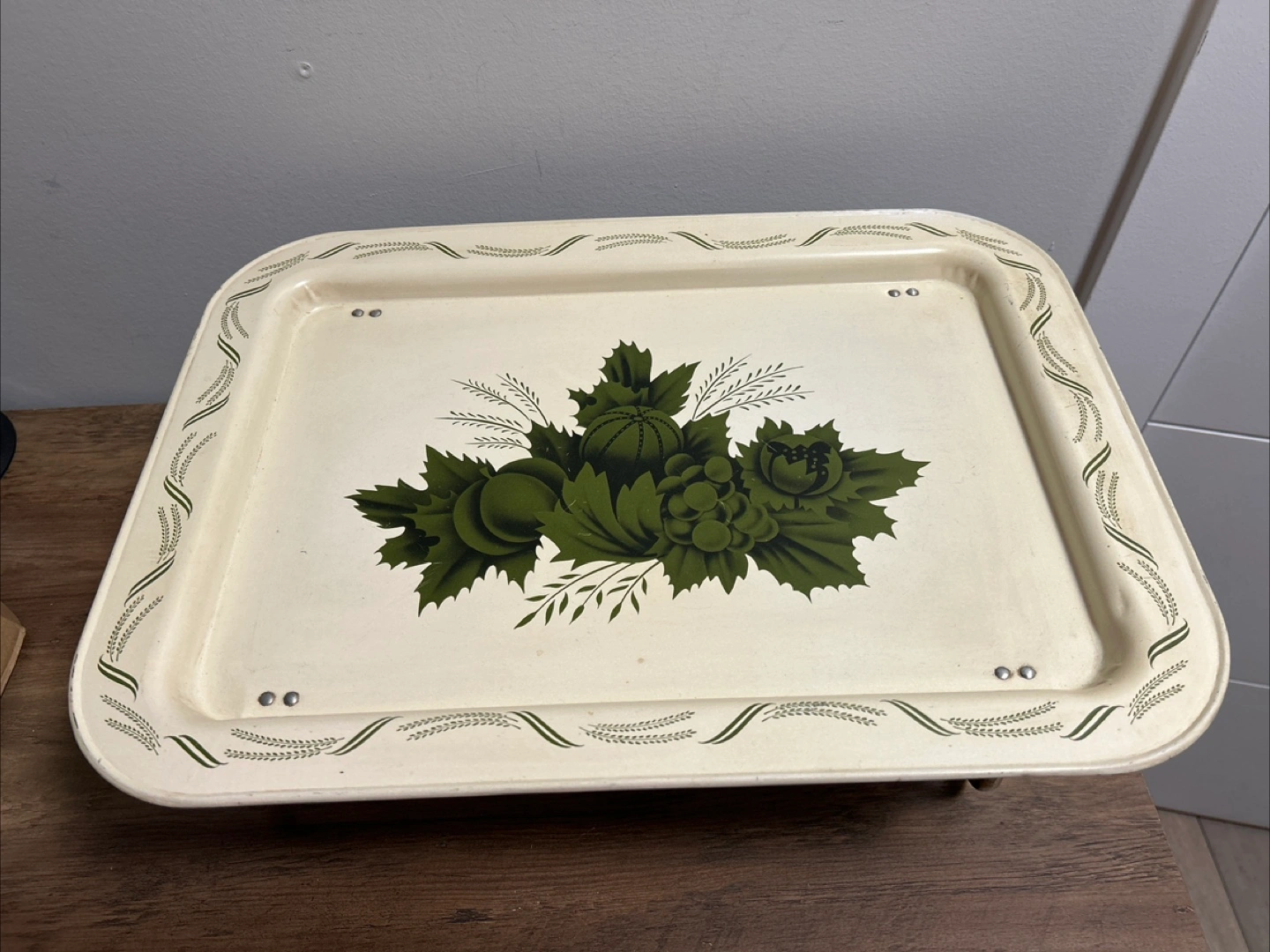 Selling a vintage folding tray table! It features a charming fruit and leaf design in green on an off-white surface. The legs easily fold for convenient storage. Perfect for serving snacks or adding a touch of retro style to your home!