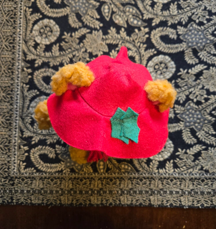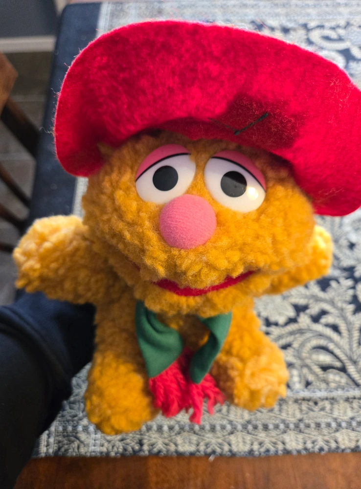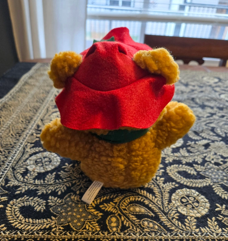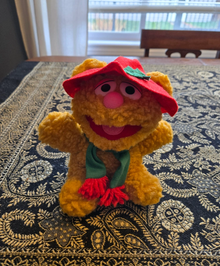 Selling a vintage Fozzie Bear plush dressed up for Christmas! He's wearing a red hat with a green holly leaf and a green scarf with red fringe. He's in excellent condition and ready for a new home