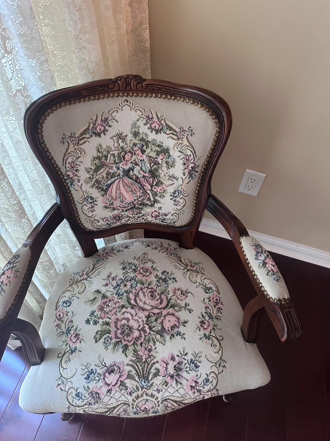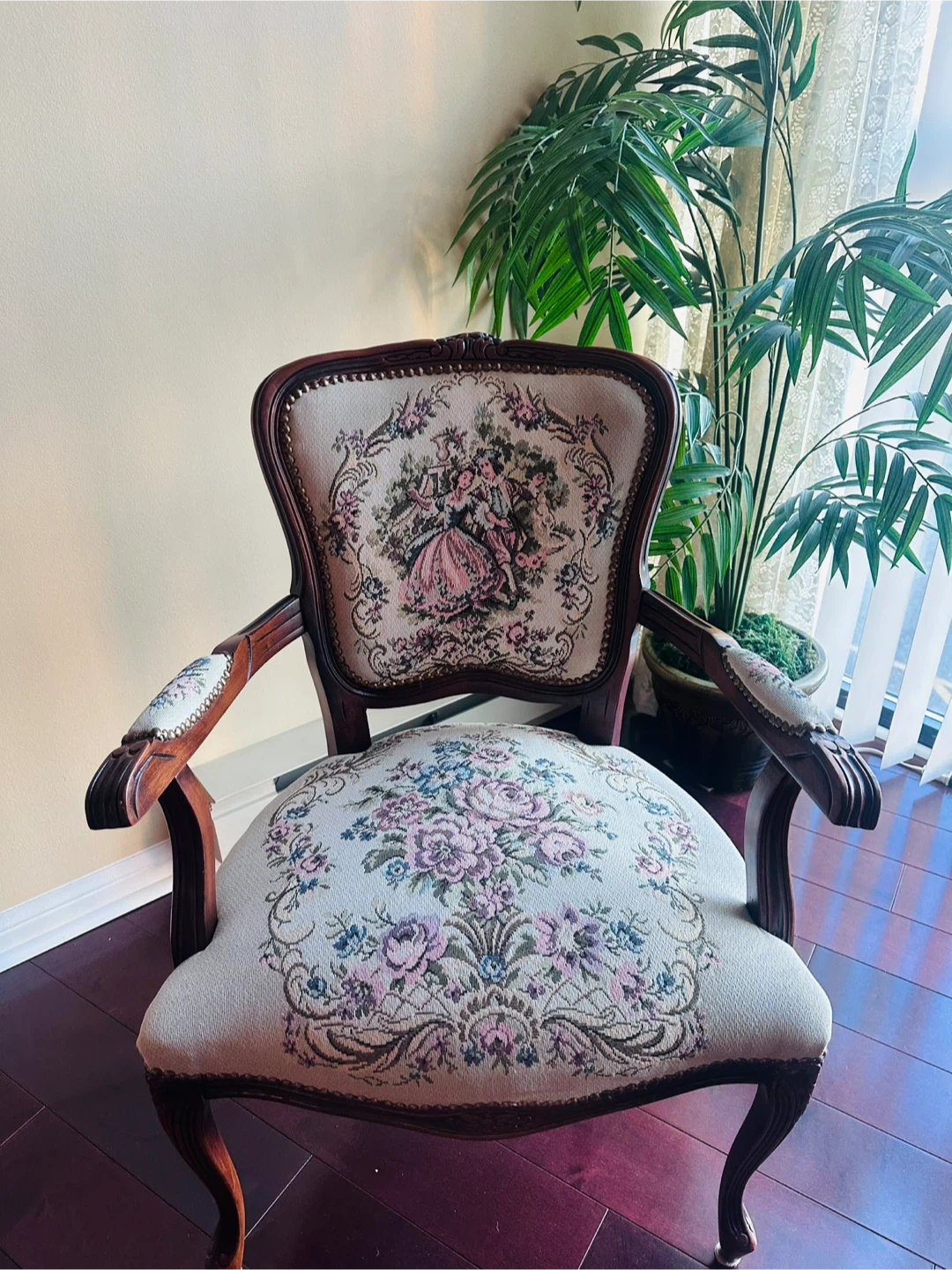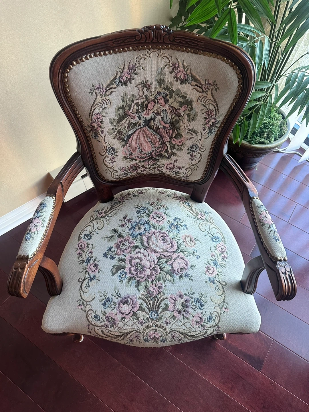 2 Beautiful antique armchairs with floral upholstery! The chairs features a detailed wood frame and a unique design. It's perfect for adding a touch of vintage charm to any room in your home
