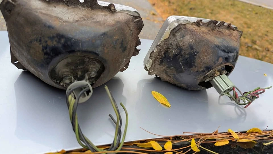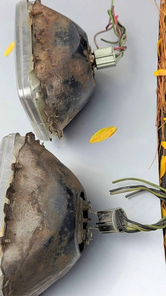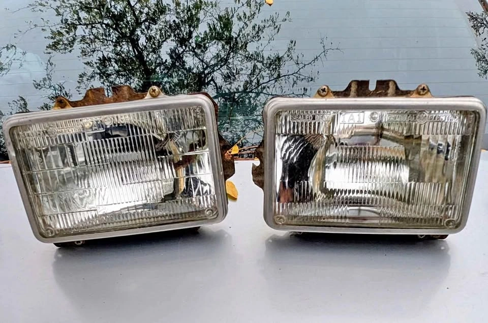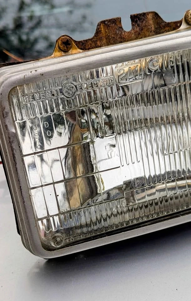 Pair of vintage General Electric sealed beam headlights (models 1A1 & 2A1), removed from storage. Both are original glass-front units with metal housings and wiring intact. Approx. 5” x 7” rectangular. Condition: Untested, visible rust on housings, glass intact. Ideal for classic car restoration, rat rod, or parts display
