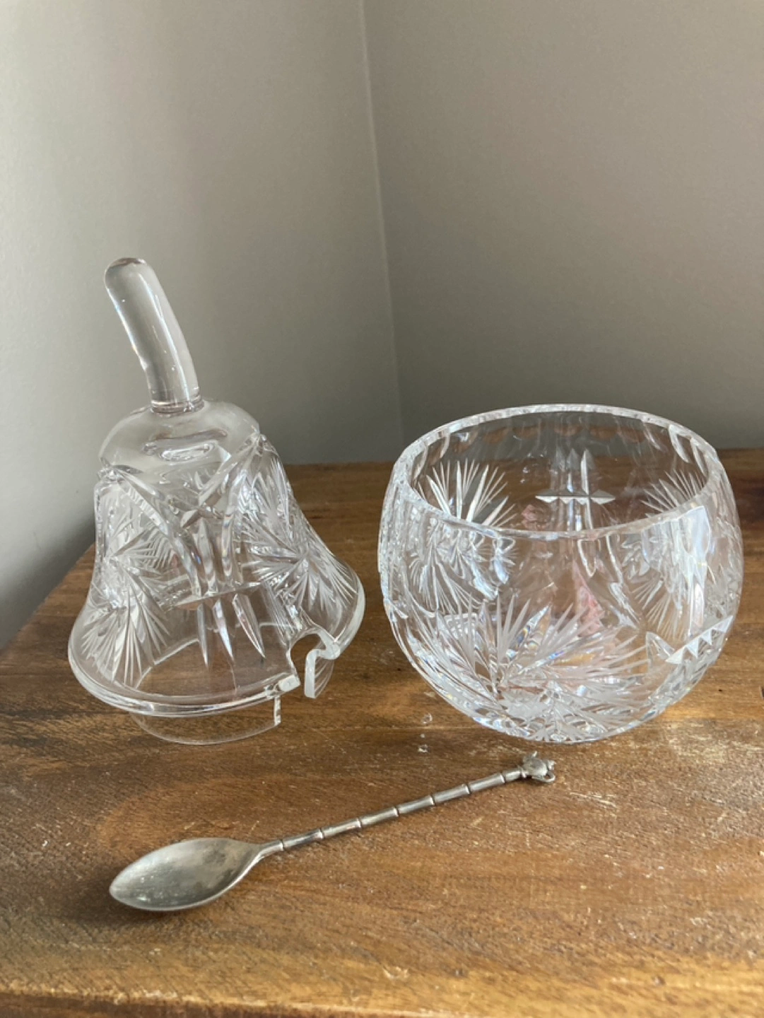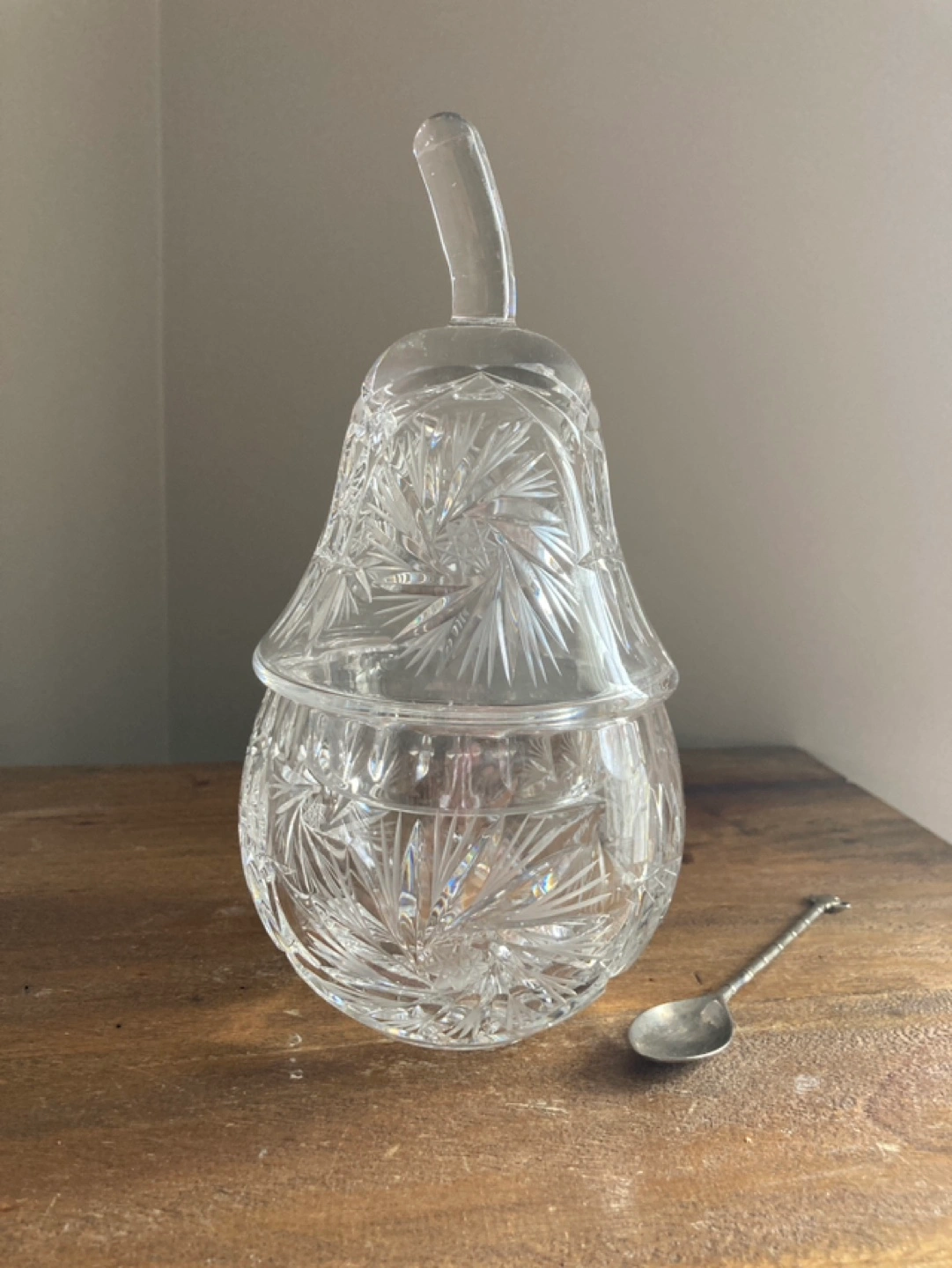 Had this a very long time. Perfect condition. Pinwheel crystal. Comes with bonus spoon. Can be used for jam/pickles/ whatever!