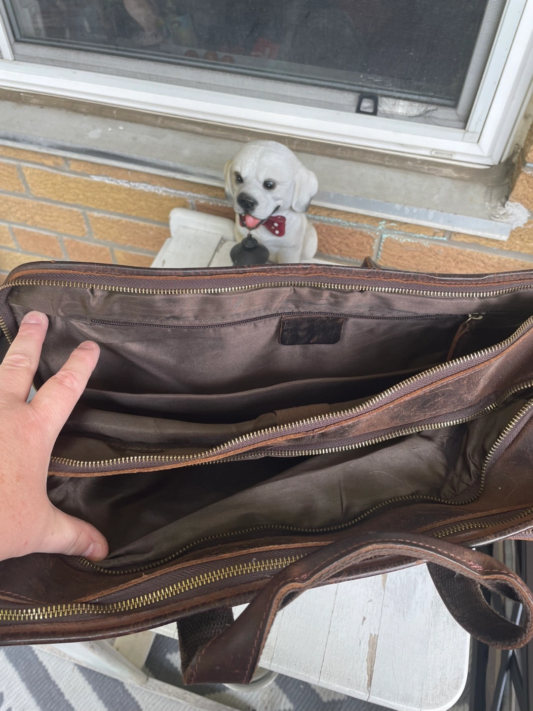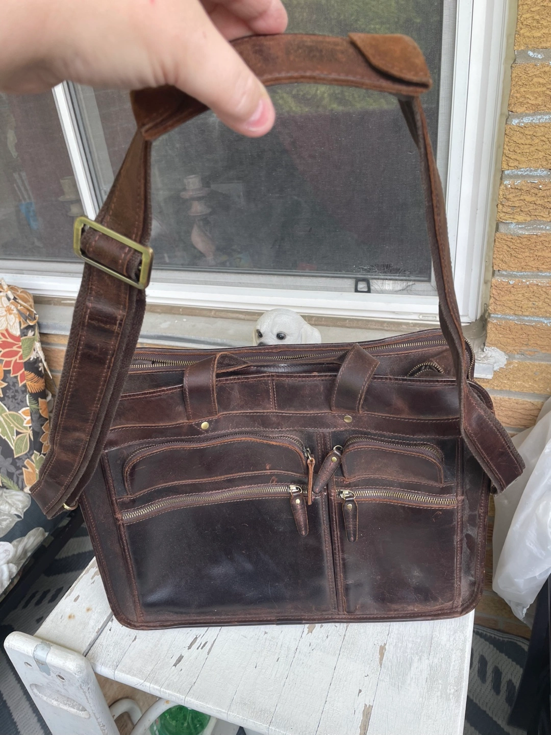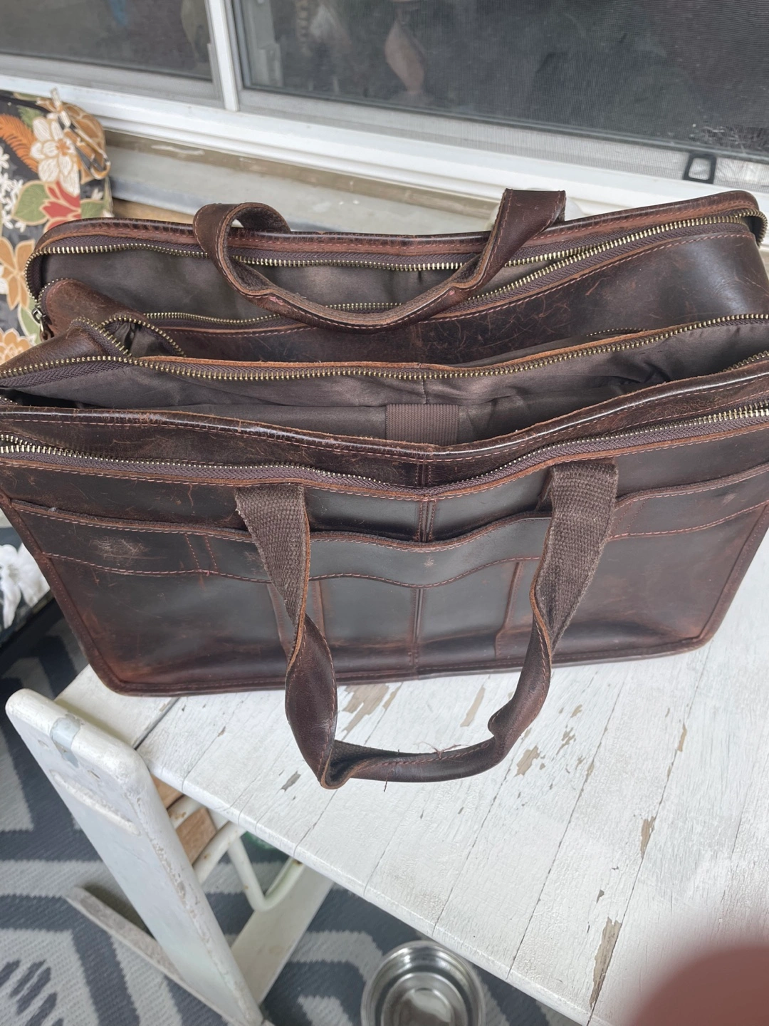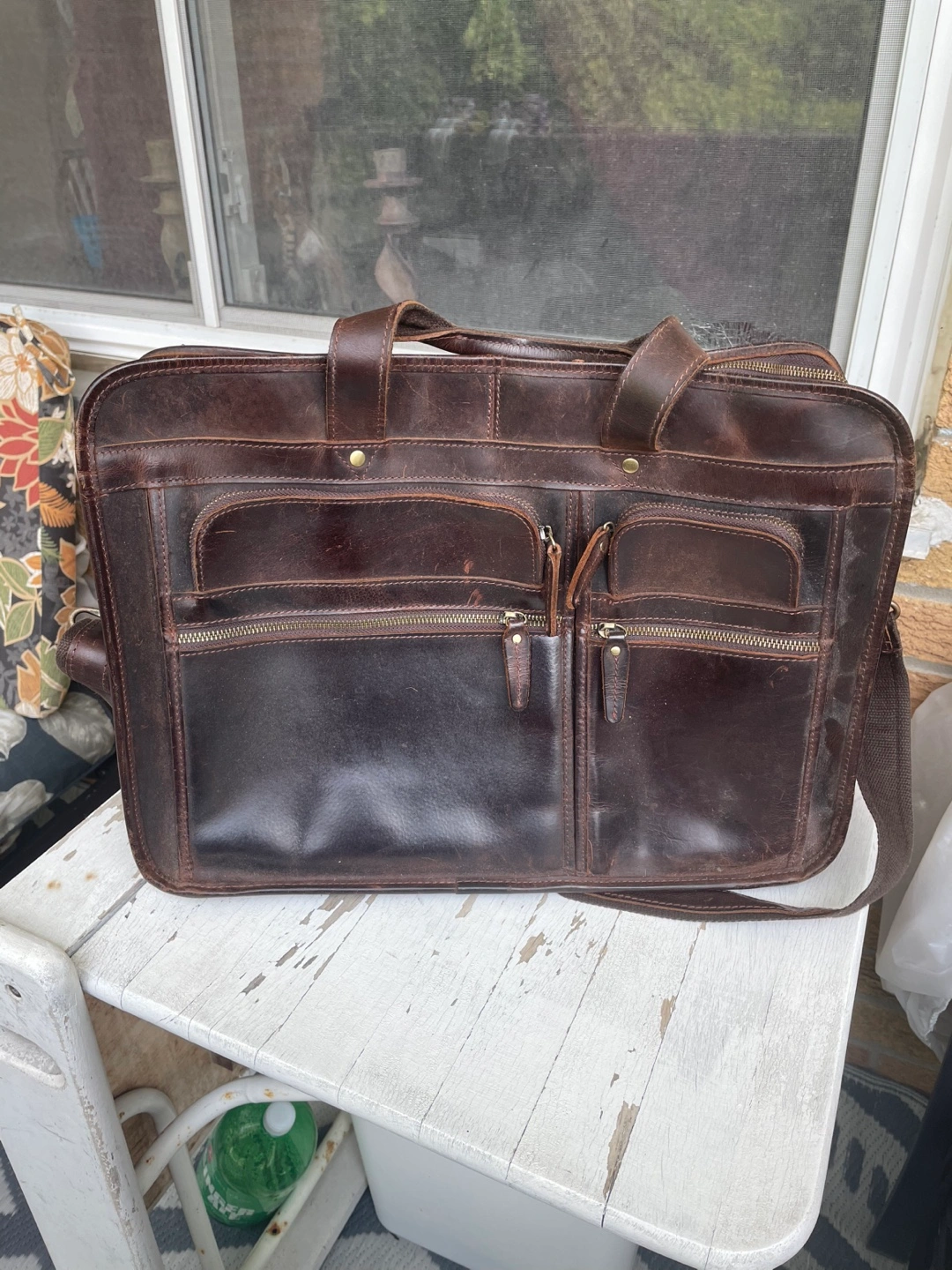 Distressed Brown, has multiple pockets so you can hold papers, electronics and accessories. laptop divider inside bag, has reinforced handles for durability. Approximately 17.5” wide x 7.5” deep x 11.5” tall (includes adjustable and detachable shoulder strap) GENTLY USED. PICK UP ONLY
