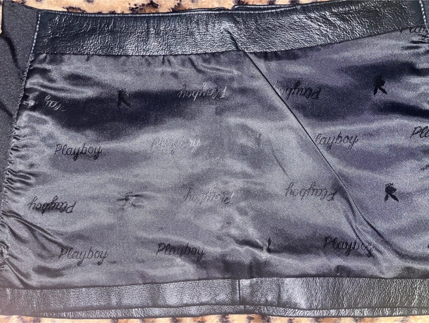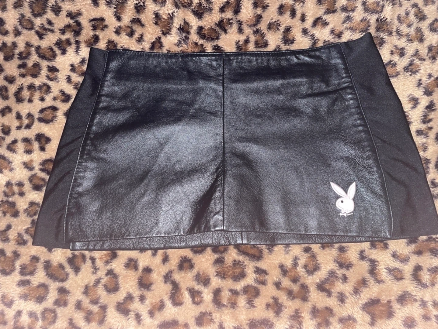 Pick up only :) Genuine black leather front and back. Black stretchy polyester on both sides. invisible zipper is 7" long. Skirt is 9.75" long and 30" hips. Detailed inner lining. Says the size is medium but it fits like a small since it's vintage.