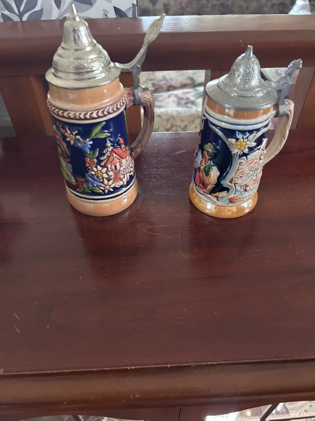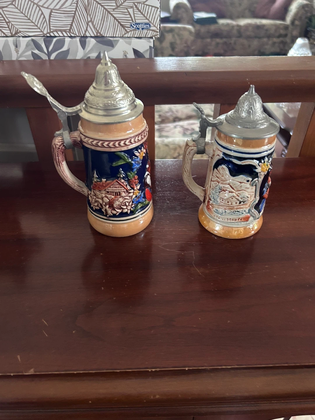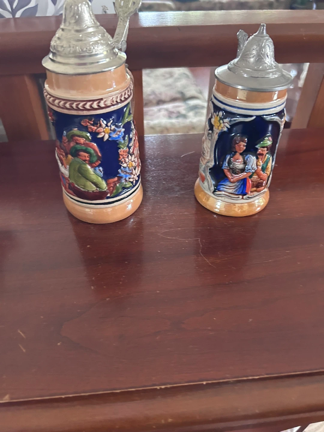 Selling a set of two vintage German beer steins. They feature traditional German designs and pewter lids. Perfect for collectors or anyone looking to add a touch of German charm to their home!
