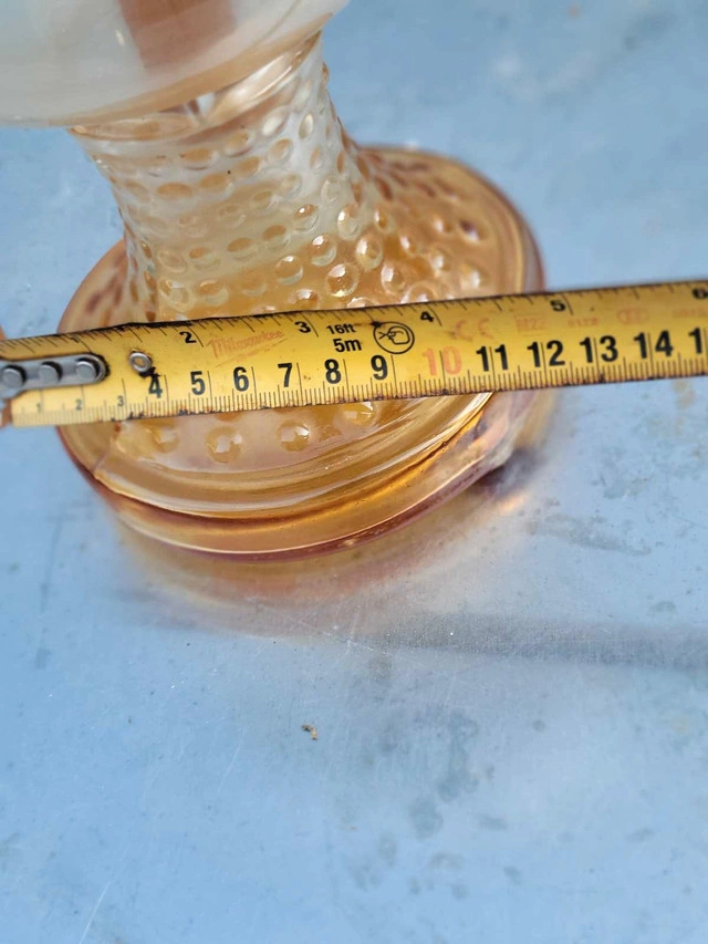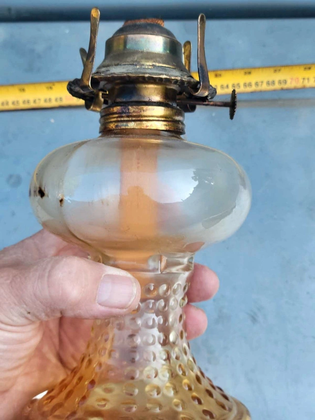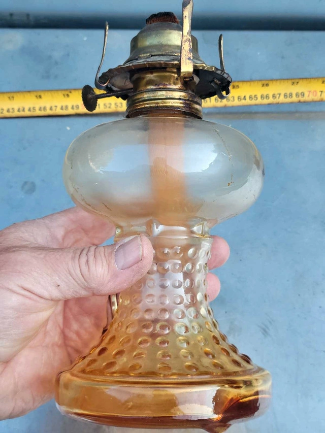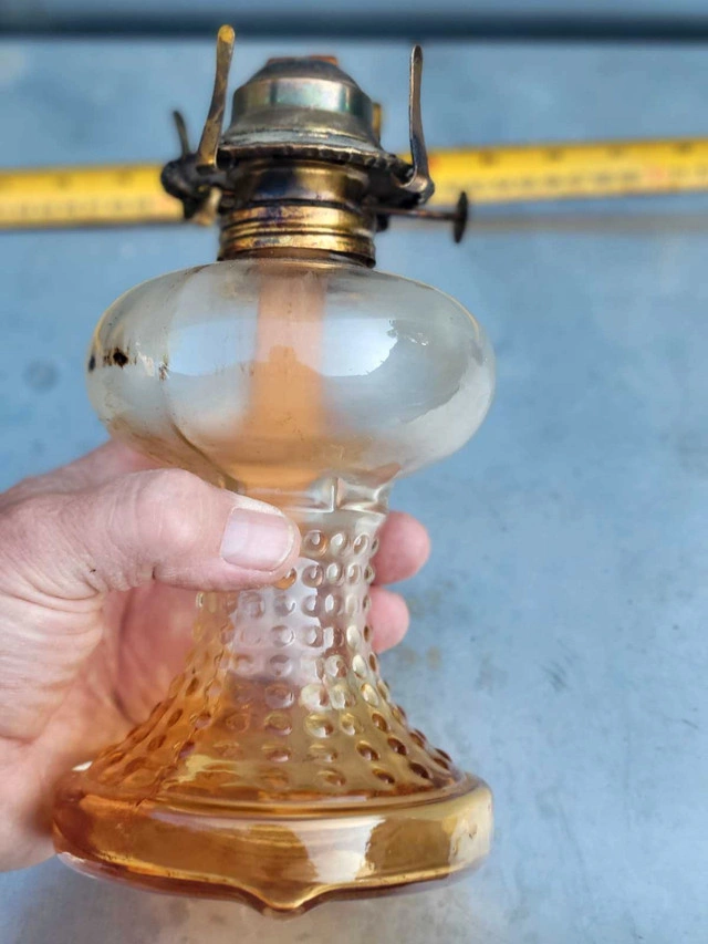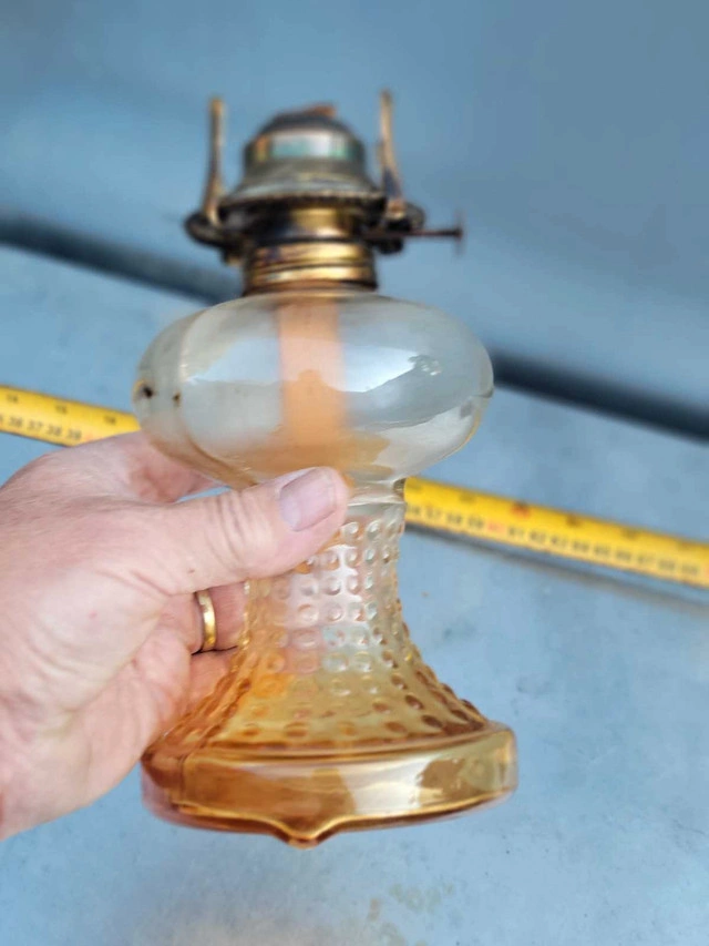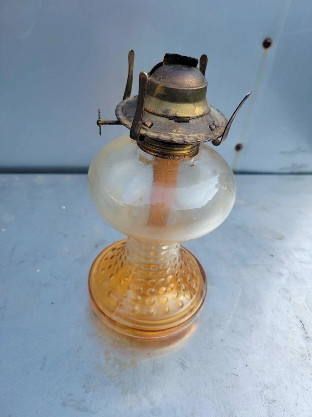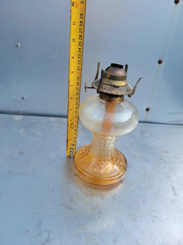 Illuminate your space with a touch of nostalgia using this Vintage Glass Kerosene Oil Lamp. Echoing the ambiance of the 1950s, the lantern design casts a warm, inviting glow, perfect for setting a cozy atmosphere in any room. The rich amber hue of the glass adds a rustic charm, complementing the oiled finish that enhances its vintage appeal. Crafted from durable glass, this oil lamp is a testament to the timeless style and practicality of the mid-century era. It's a delightful addition for collectors or as a functional piece to adorn your home with a classic touch. Whether you're looking to enhance your decor or searching for that unique collectible, this lamp is sure to captivate and charm.