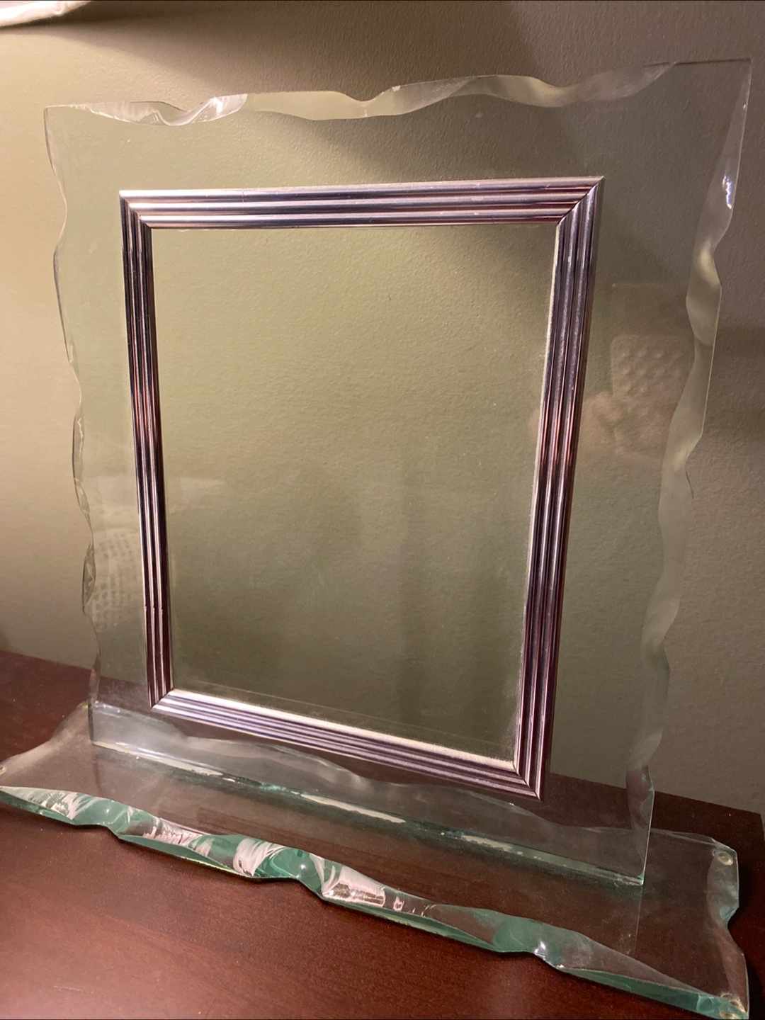 Beautiful glass photo frame. Features a wave-edged design and chrome accents. Perfect for displaying a cherished photo. Holds 8 x 10 photo