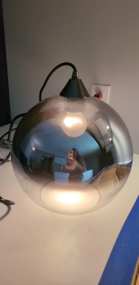 Silver globe pendant light from a film set Includes adjustable cord and bulb. Can be hard wired or swagged and plug in