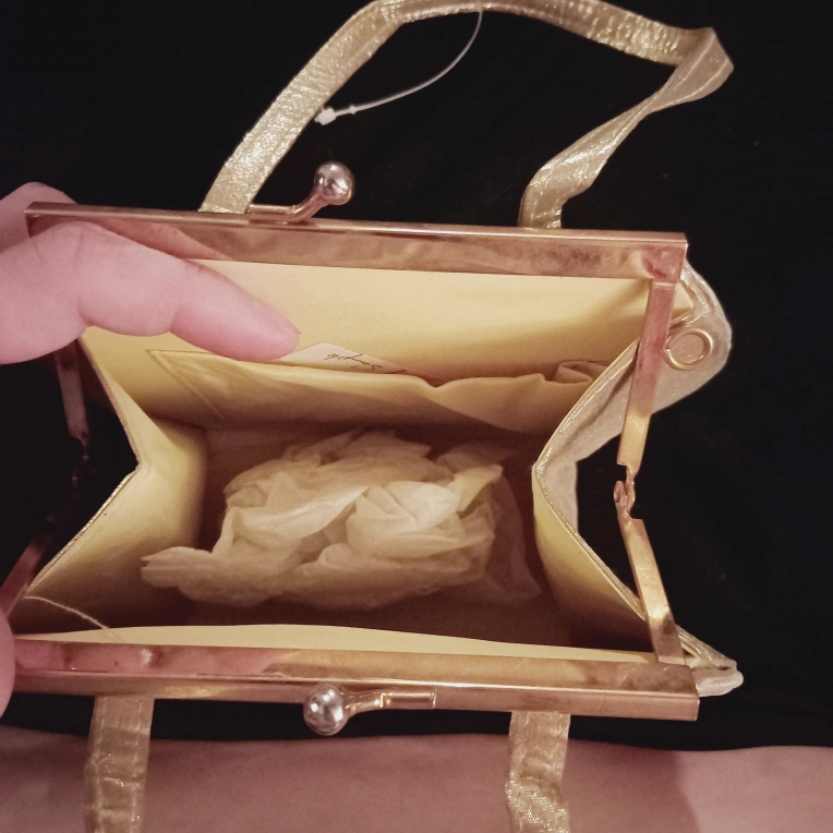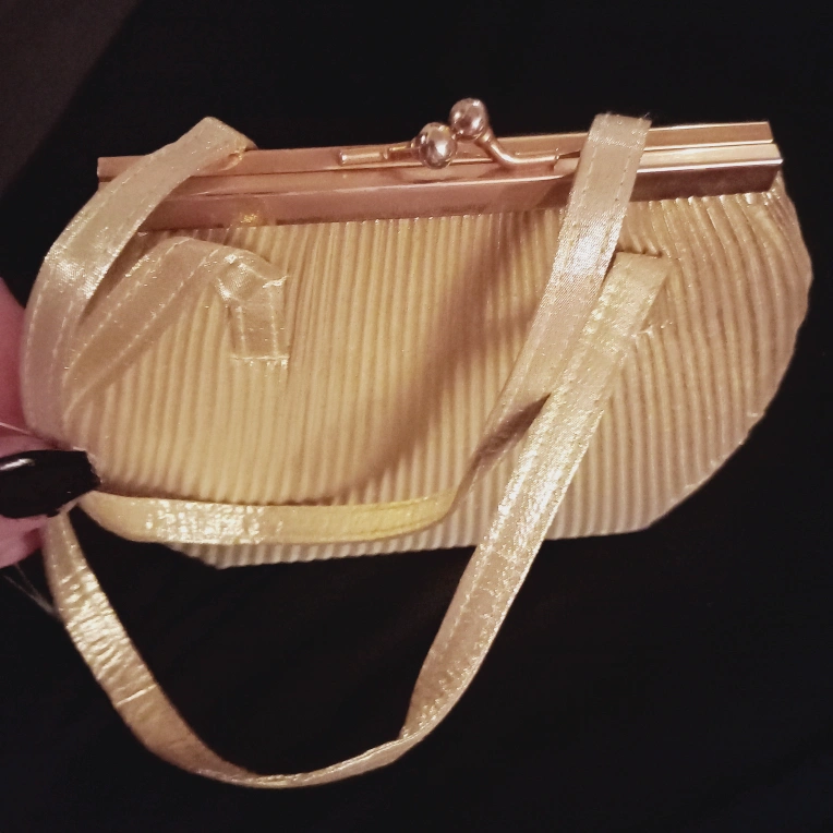 Selling a lovely vintage gold pleated handbag! It's in great shape and has a unique, classic look. Perfect for adding a touch of retro charm to any outfit. The bag features a metallic gold exterior with a pleated design and a gold-tone frame and handles. The interior is lined with a light yellow fabric and has a small pocket.