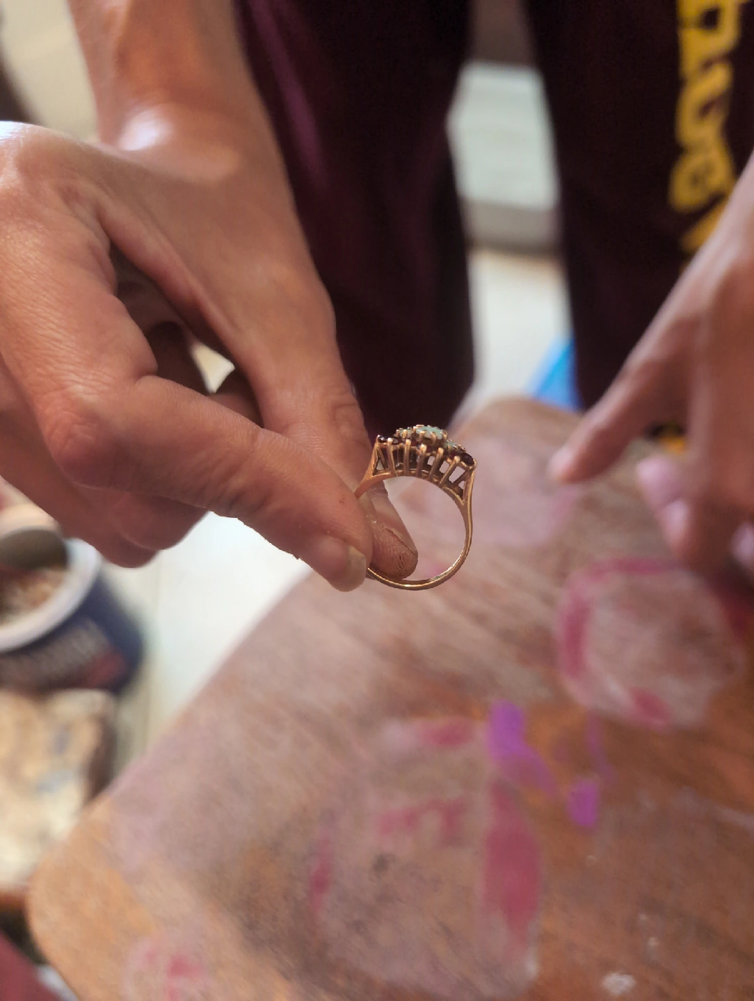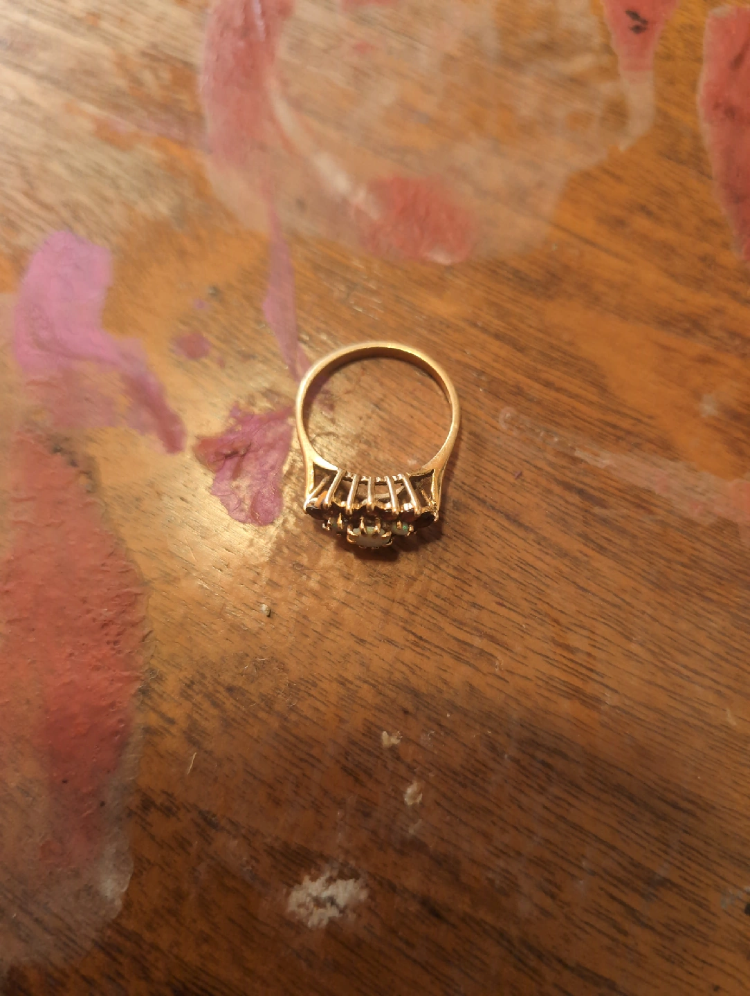 Selling a vintage gold ring, it has a lovely floral design with small Orange garnets around a central opals. It's a beautiful piece! The ring is from 1960