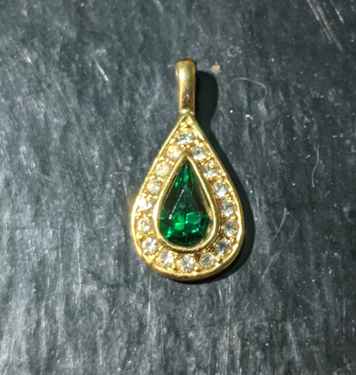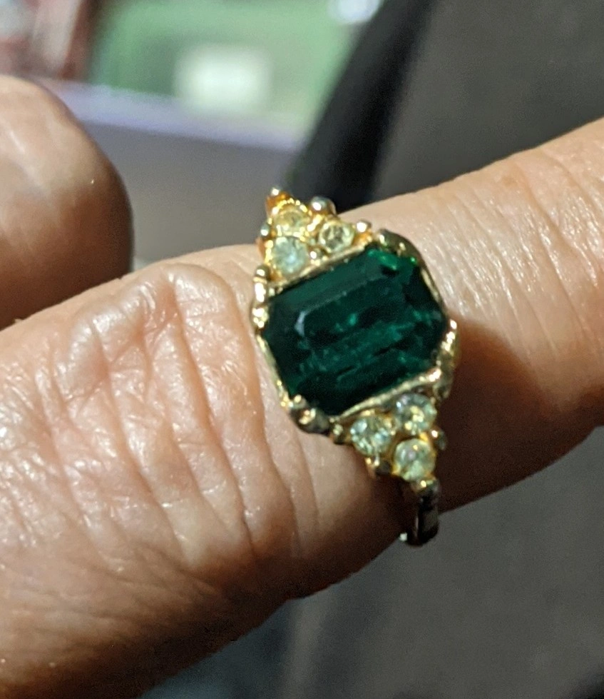 Selling a vintage gold tone pendant and ring set. The pendant features an emerald green stone surrounded by rhinestones in a teardrop shape. The ring has a rectangular emerald stone with smaller rhinestones around it. Both pieces are in good condition and would make a lovely addition to any jewelry collection don't remember the size of the ring