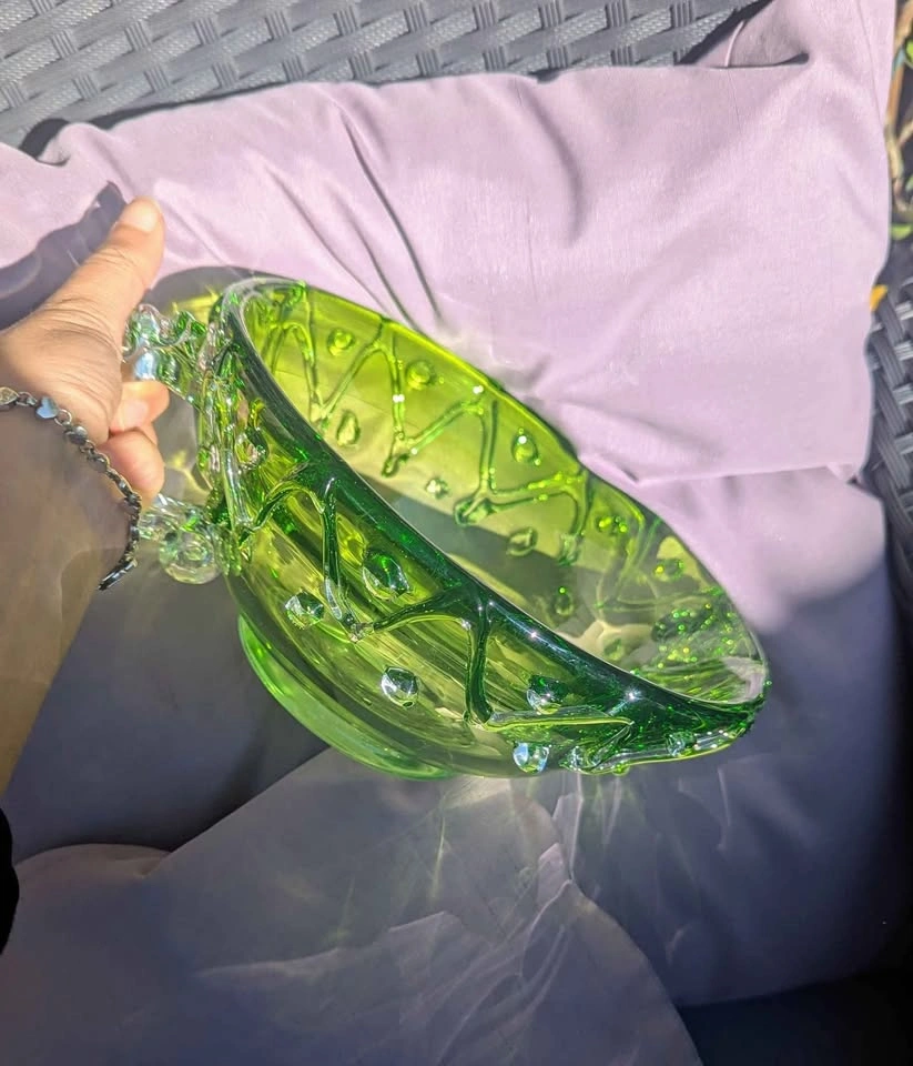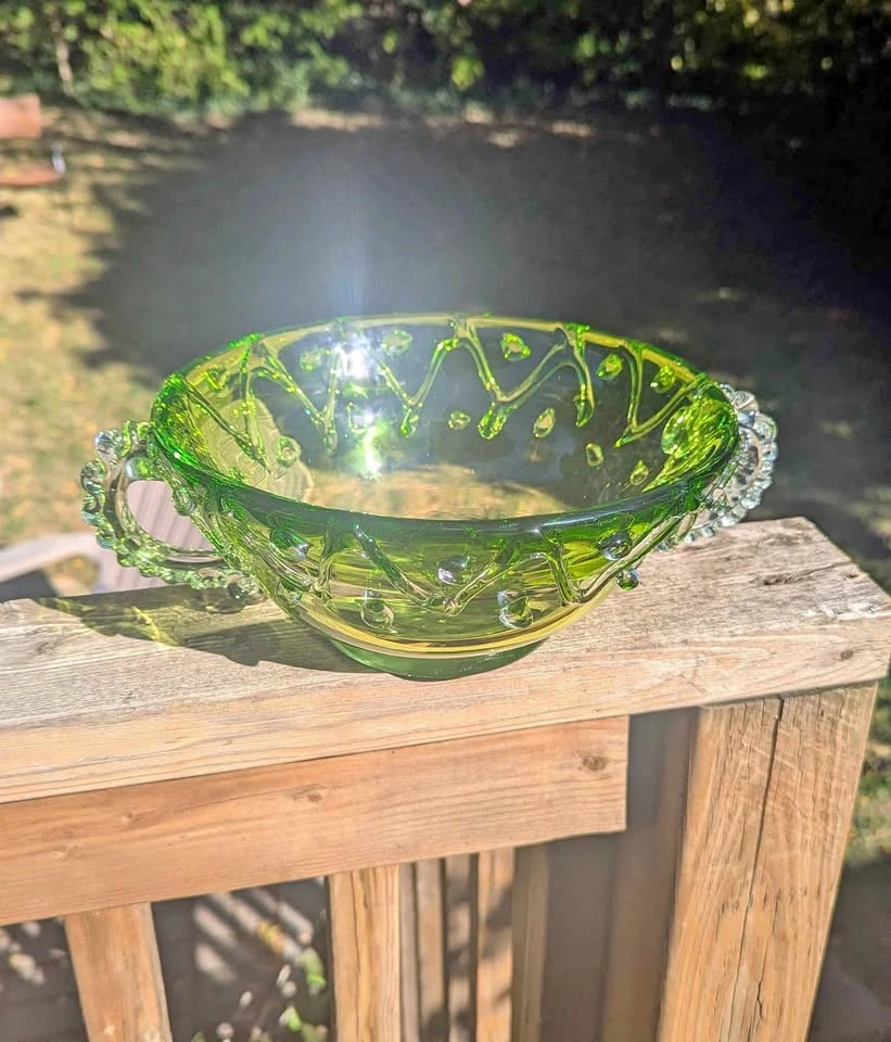 Beautiful (Murano?) hand-blown art glass centerpiece bowl in brilliant lime-green glass with clear applied handles and raised zig-zag droplet detailing. Perfect as a statement fruit bowl, centerpiece, or collectible display piece. No chips or cracks, excellent condition.