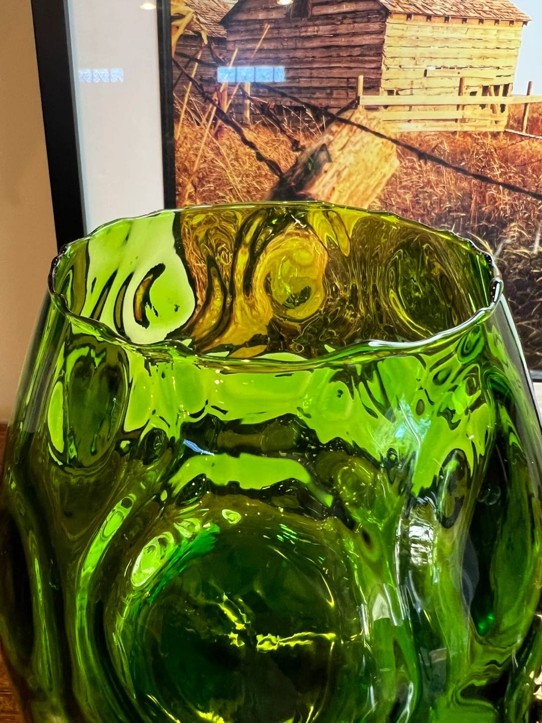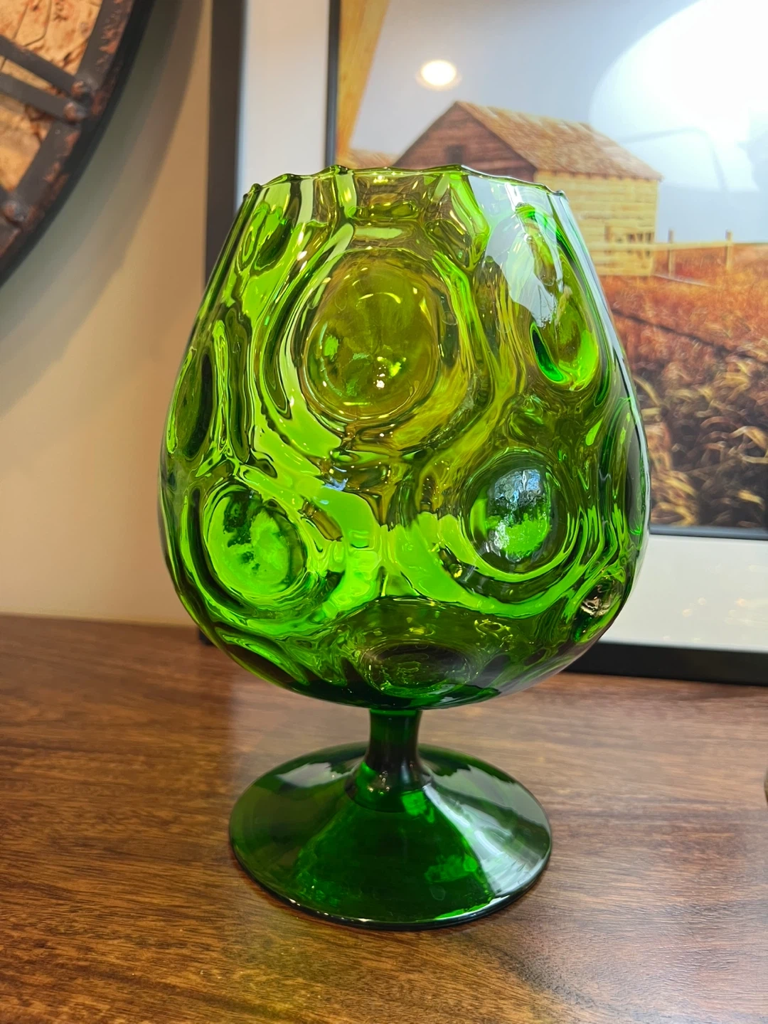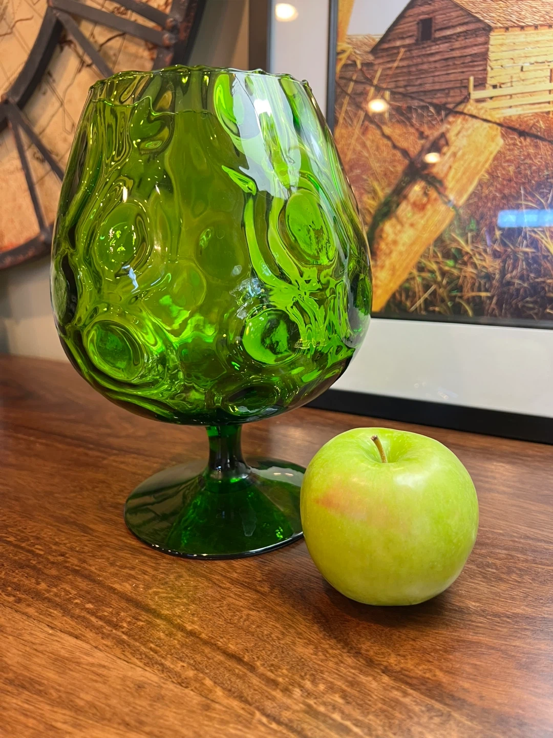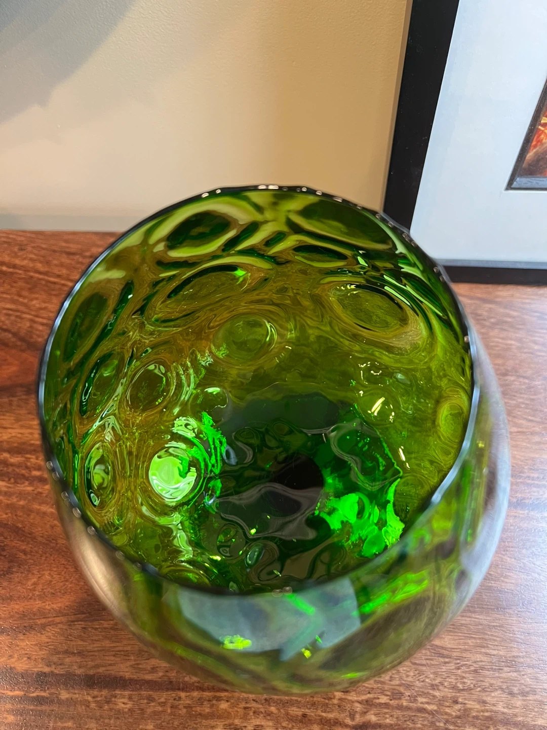 Stunning colour!! Pairs nicely with various Mid-Century inspired decor Most likely hand blown Attractive optic art glass in a contrasting green Ridged edge It would make a stunning addition to any table, shelf or mantel… Unmarked Mint Condition!! 8.75” tall (apple for size reference) 4.25” across the opening Asking $30 Interested? Message me and please check my other listings…