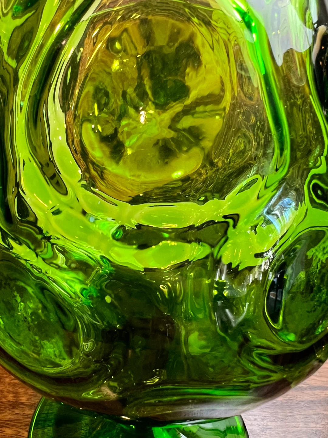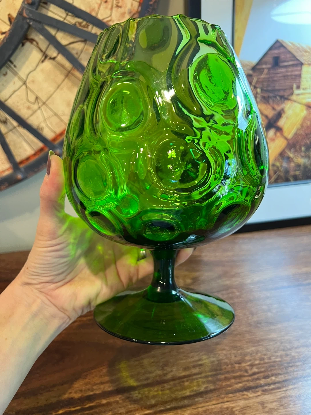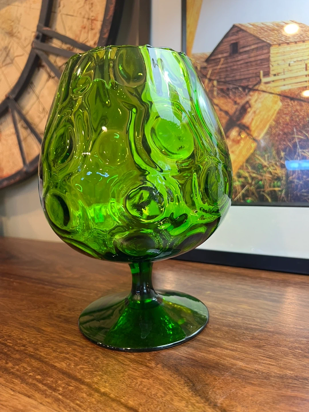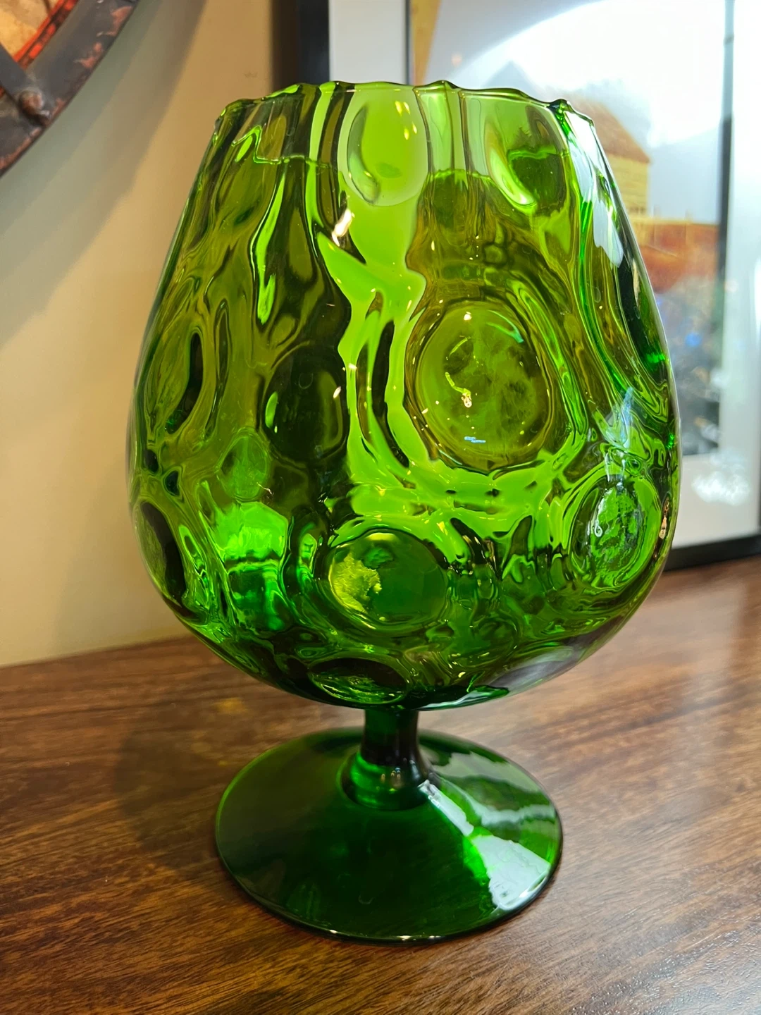 Stunning colour!! Pairs nicely with various Mid-Century inspired decor Most likely hand blown Attractive optic art glass in a contrasting green Ridged edge It would make a stunning addition to any table, shelf or mantel… Unmarked Mint Condition!! 8.75” tall (apple for size reference) 4.25” across the opening Asking $30 Interested? Message me and please check my other listings…